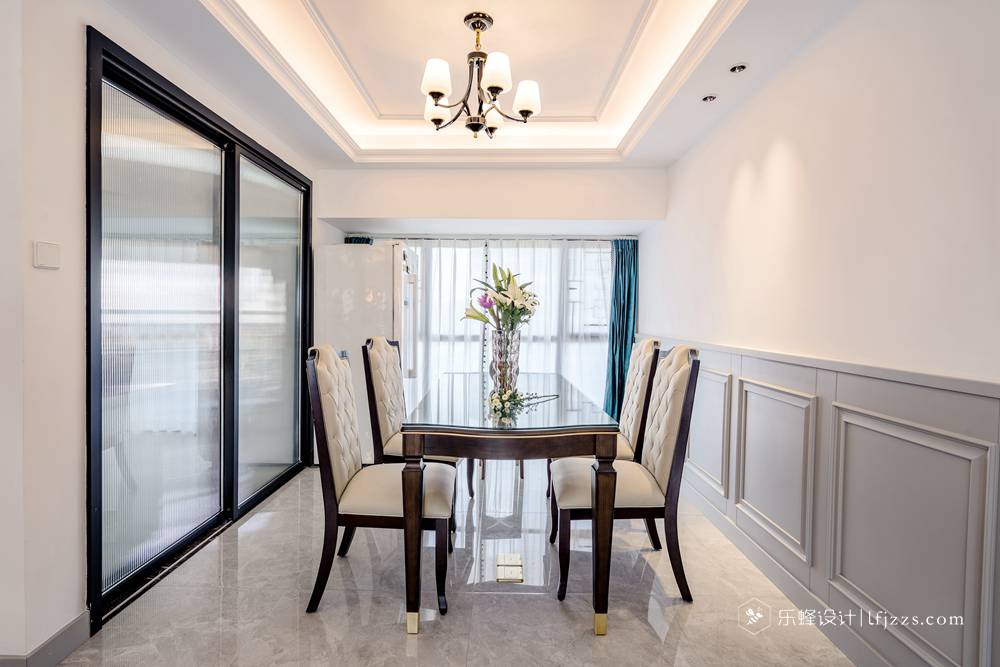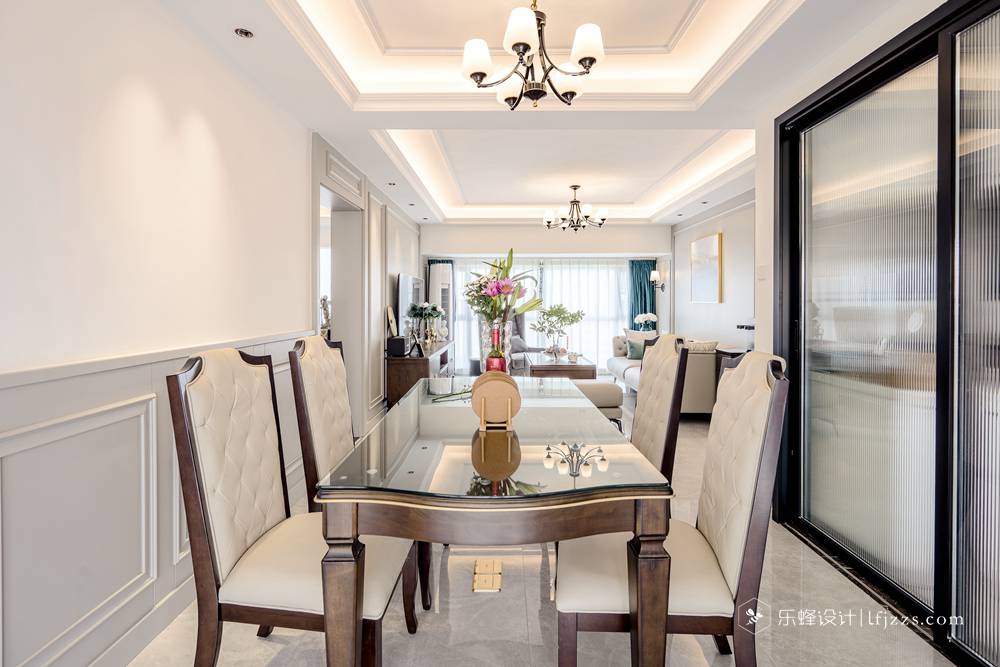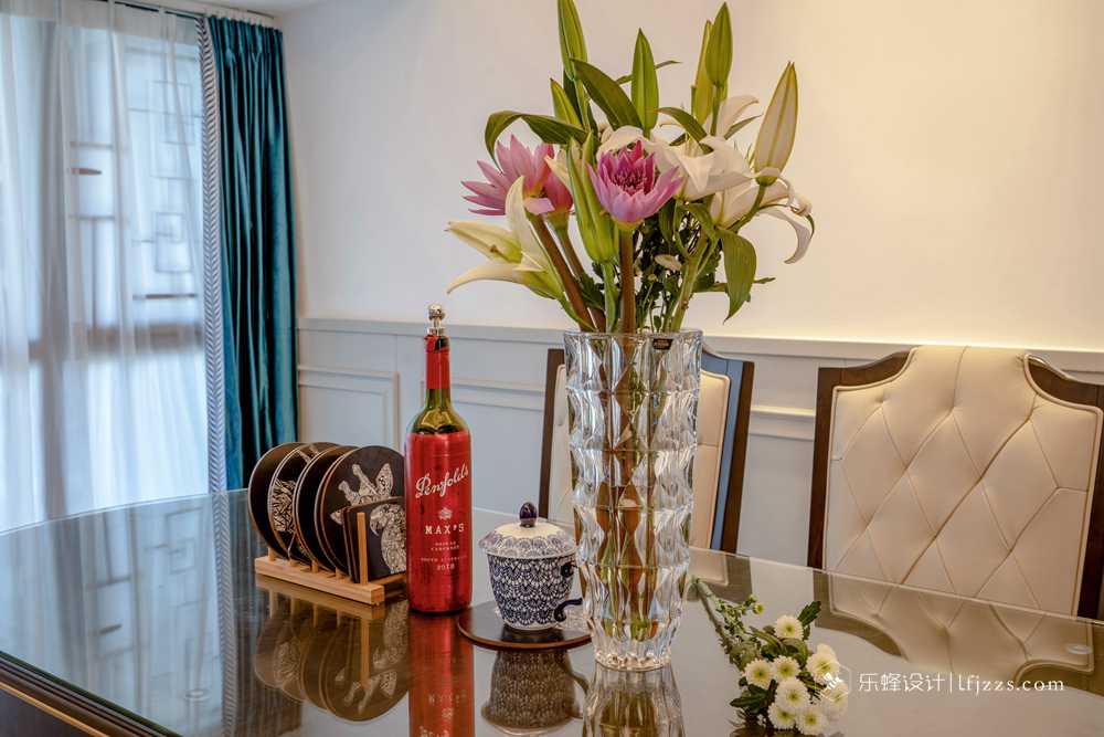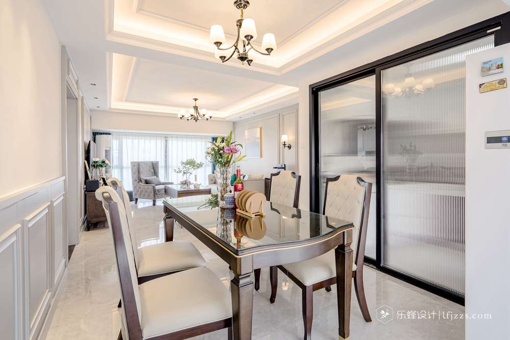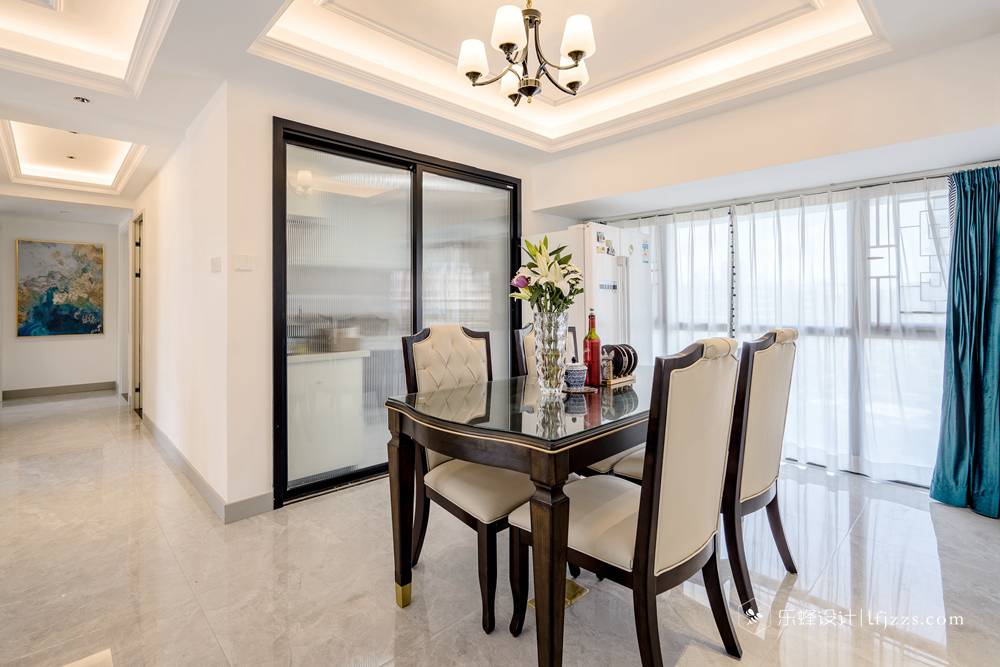 餐廳的餐桌也屬于美式風格吊燈和客廳的吊燈結構樣式差不多,廚房的長虹玻璃也屬于客廳裝飾的一部分,提升了整體的格調和氣質。
