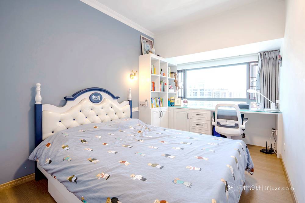 在兒童房的布置中,我們以藍色的色調為主,開闊的空間,讓衣柜、床和書桌的布置都游刃有余,給孩子留了充足的活動空間。