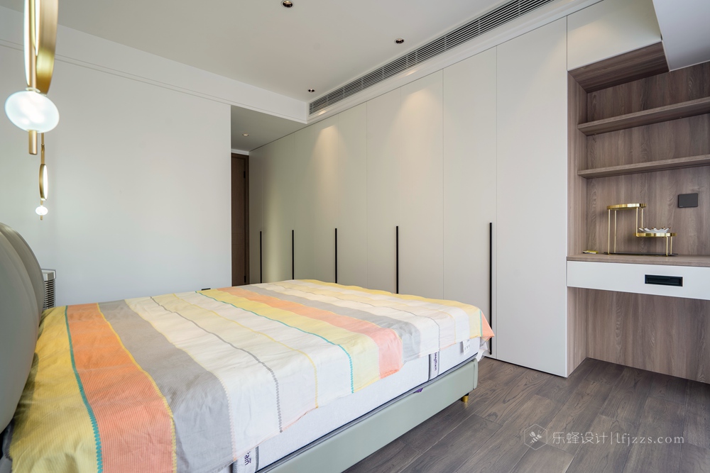 主臥作為主人休息的房間整體風格也是偏溫馨化的,整面的衣柜+書桌的組合增加了儲物空間,同時整體協同性也會更好