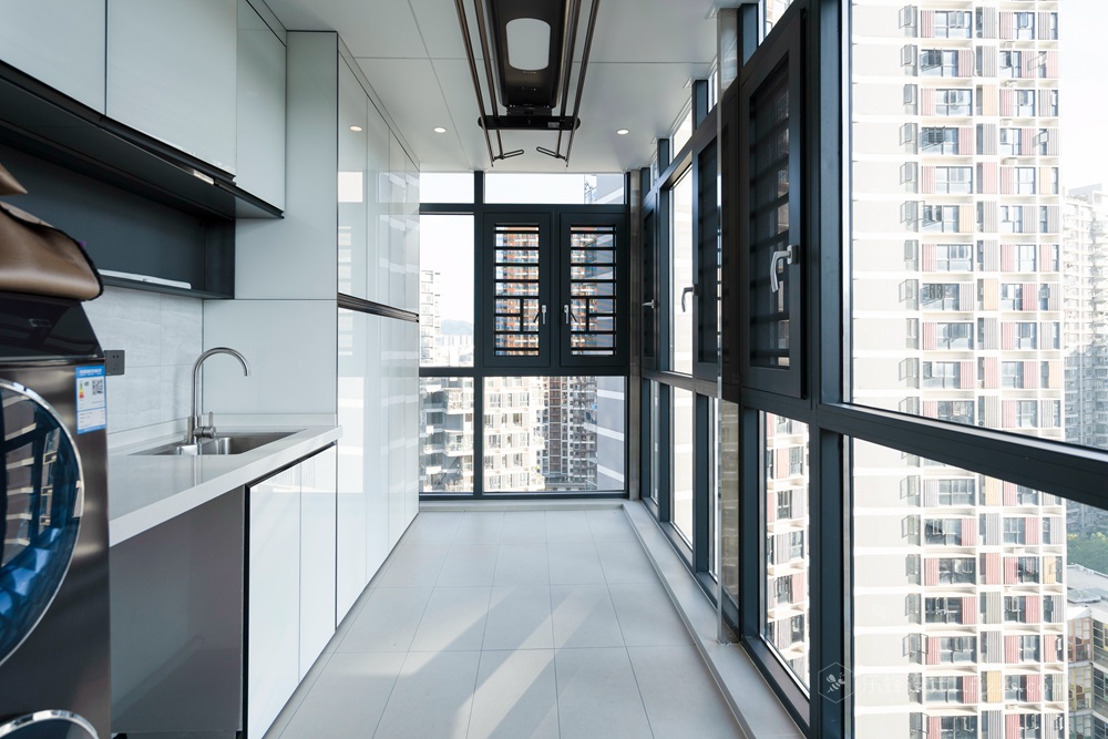 陽臺整體做封窗處理,方便日常清潔的同時也不用擔心天氣對晾衣區的影響啦;增加一組家政柜,輕松收納各種清潔用具