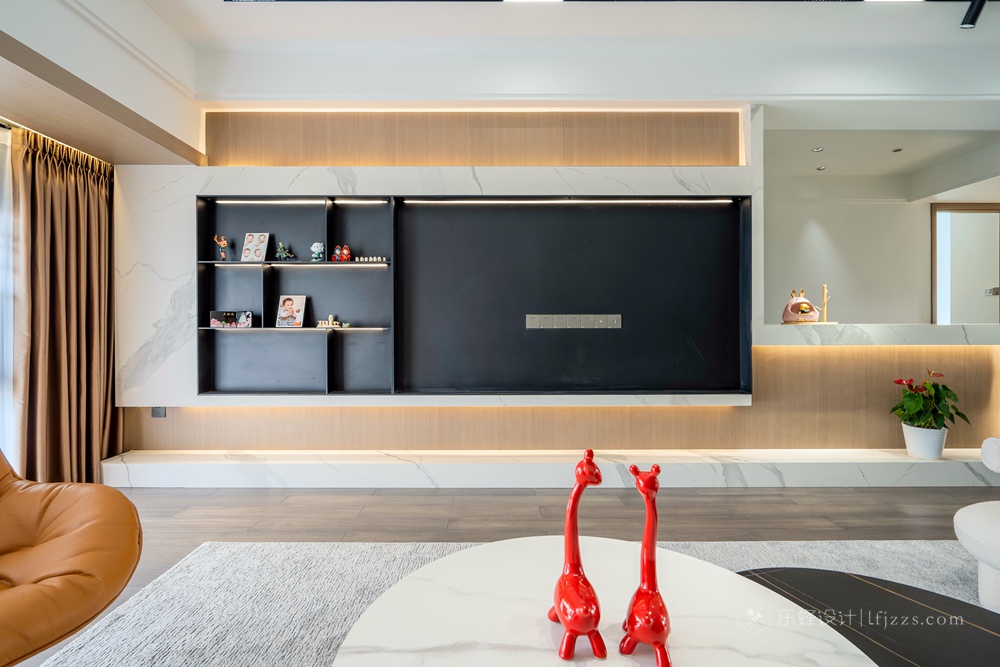 客廳因為和餐桌區域分開來,所以整體空間感更加好,無主燈吊頂在保證層高的前提下內嵌了線性燈和防眩筒燈模組,搭配墻面的暗藏燈帶營造出溫馨的風格