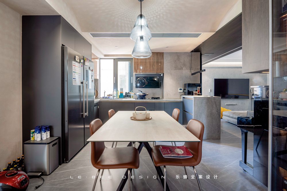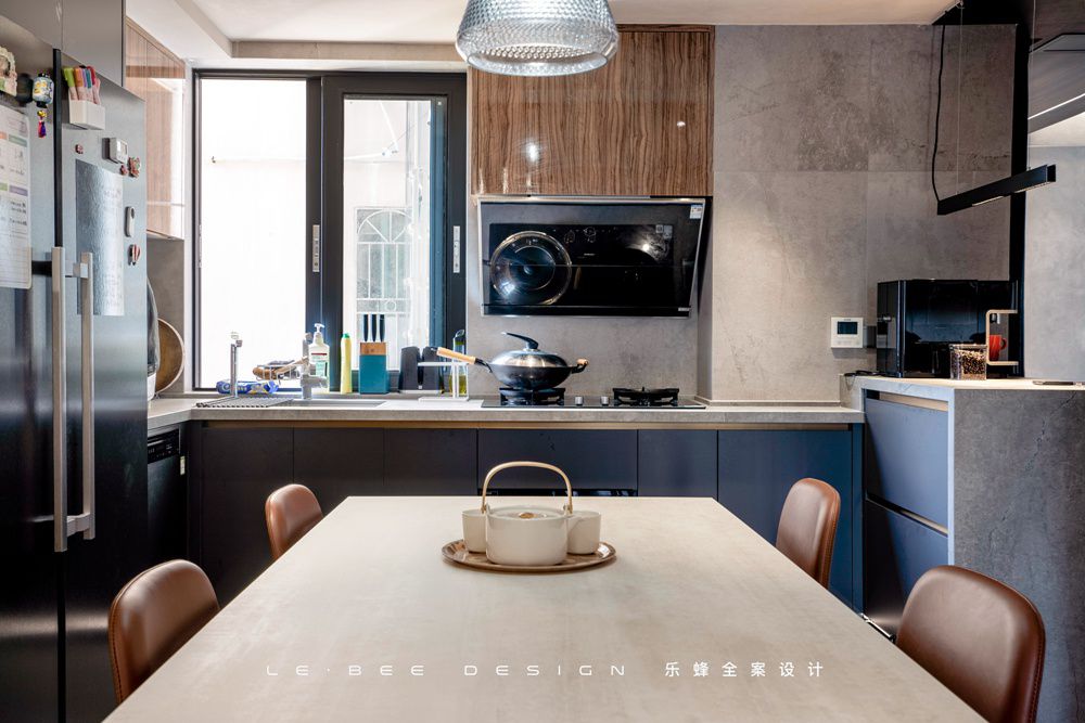 在餐廚的設計中我們拆除了餐廳和廚房中間的墻體,整合了兩個空間的功能,做u型櫥柜,一側留出高度差作為吧臺使用,中間放置餐桌動線環繞四周十分流暢。