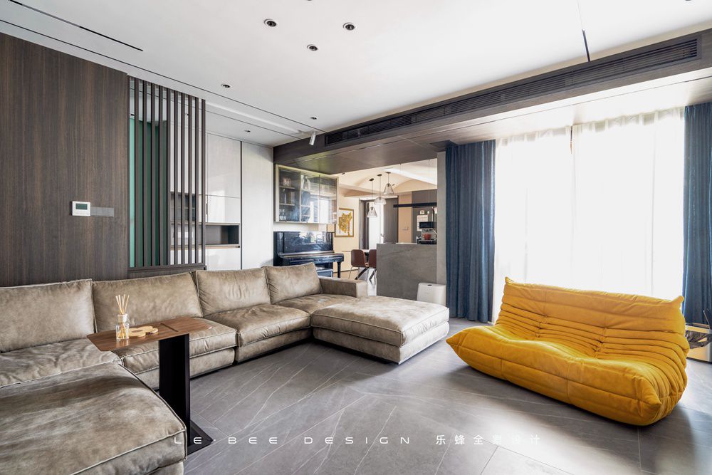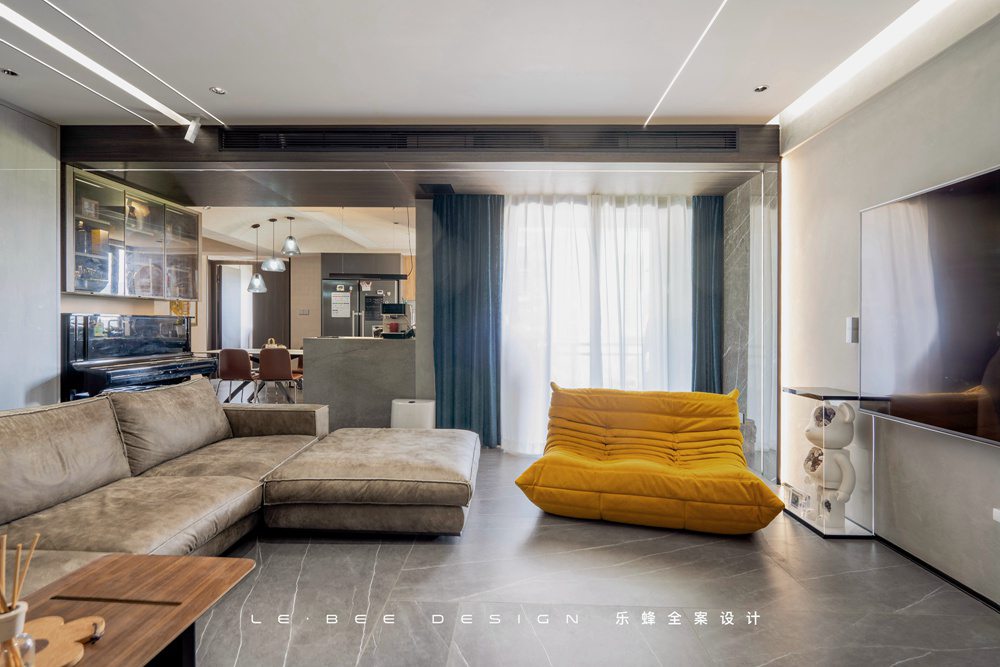 客廳是家里最酷的地方,通過以灰色為主色調,部分軟裝作為點綴的方式讓高級感盡顯眼前,線性燈和防眩筒燈作為無主燈吊頂燈光的主光源,能做到更均勻的燈光覆蓋。