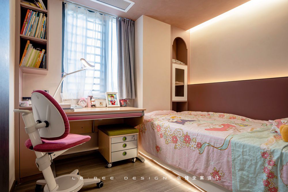兒童房沒有大面積的同一色彩明度,而是通過粉色、玫紅色、紫色的互相交替來凸顯空間的少女心,同時利用燈帶的輔助照明功能,保障孩子在光線較暗時候的安全。