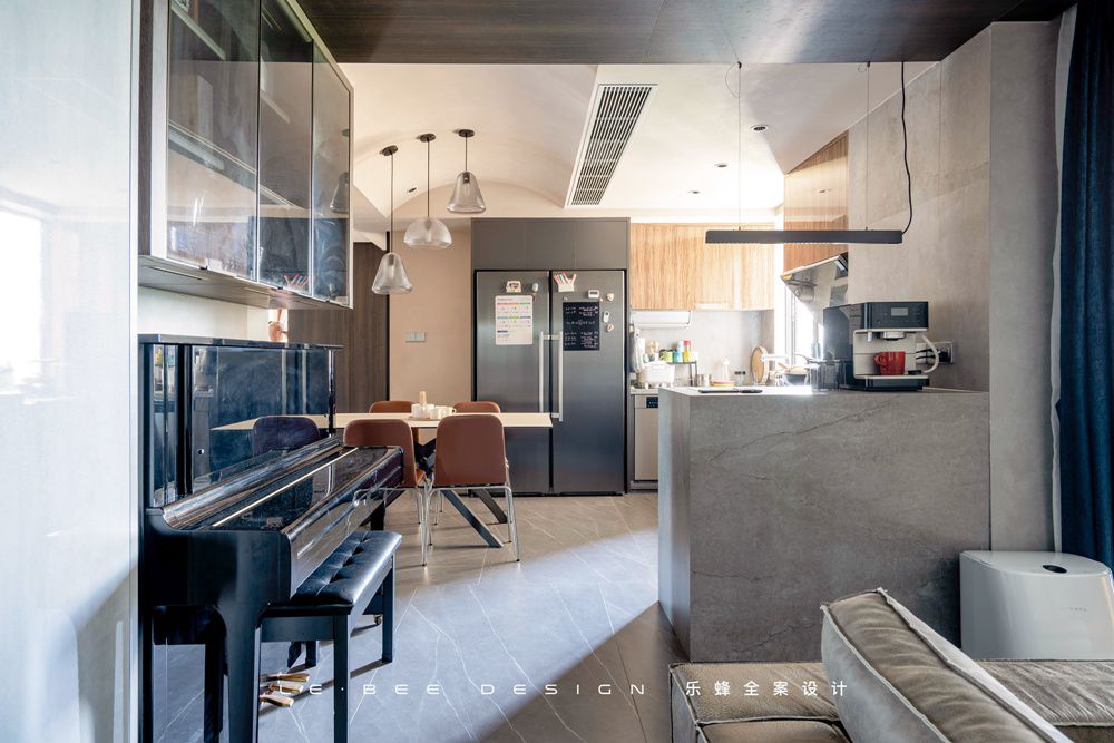 餐廳區域的吊頂也十分有意思,通過弧形的吊頂處理來弱化粱位給人帶來的視覺壓力,同時吊頂也和墻面一起做了藝術涂料,一體的處理顯得更加整體統一。