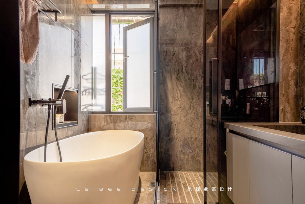 主臥衛生間在得到了擴容之后能夠容納更多的功能,浴缸和淋浴的需求都能實現,我們還在浴缸旁邊砌制了壁龕,用黑色不銹鋼做壁龕的表面材料,在儲物的同時能增加空間的設計高級感。