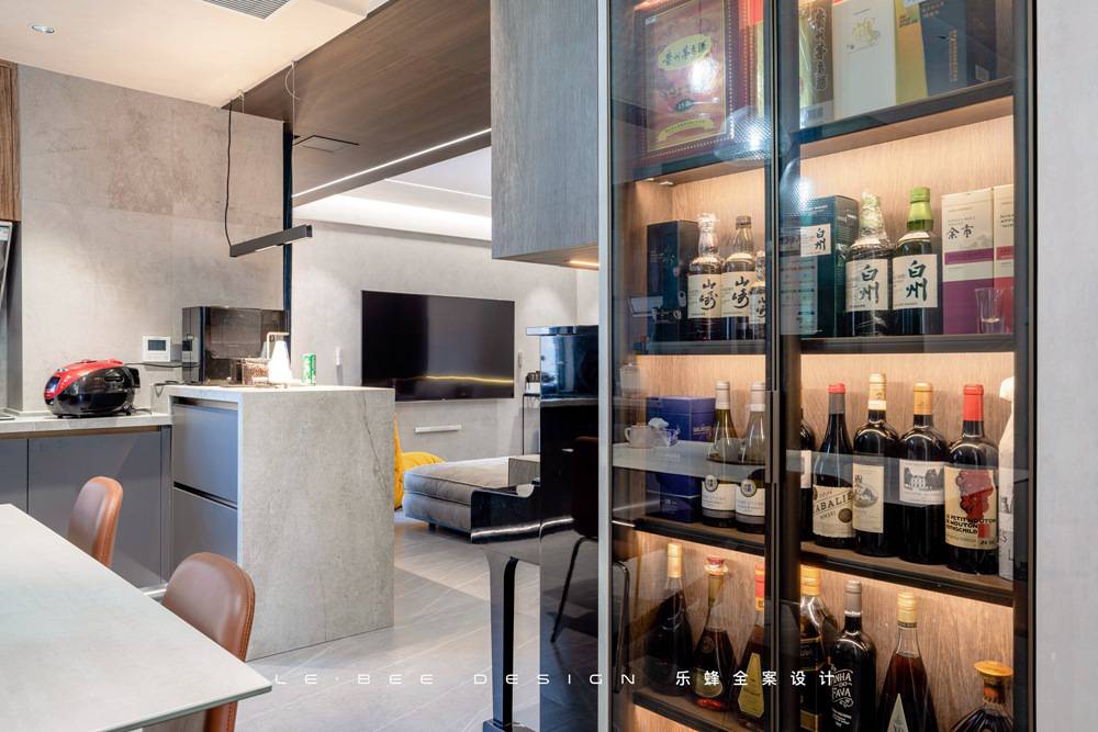 餐桌邊上怎么能沒有餐邊柜呢,在過道邊上的展示柜,通過玻璃門板和內嵌燈帶對屋主收藏的酒類做展示,在用餐、過道走動等場景下目光都能觸及到這里,給人感覺十分舒適。