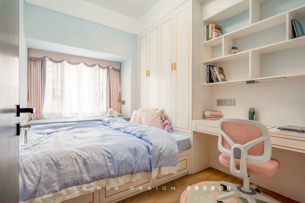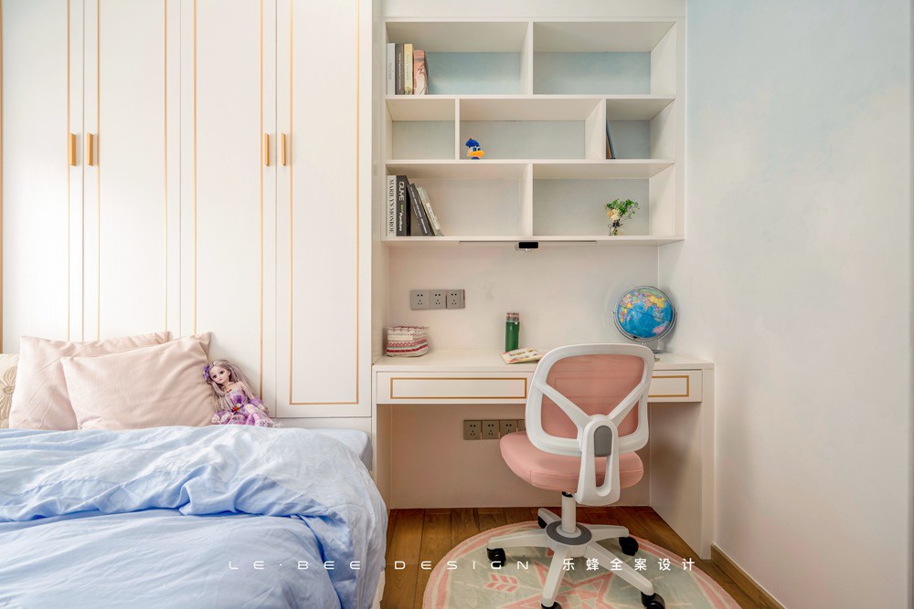- 兒童房實景圖 - 原木色地板與柔和的色彩組合,打造出粉嫩嬌俏的公主房。床、書桌、衣柜有序而設,最大程度利用空間,這里既是孩子的休憩區域,也是她獨立安靜的學習天地。