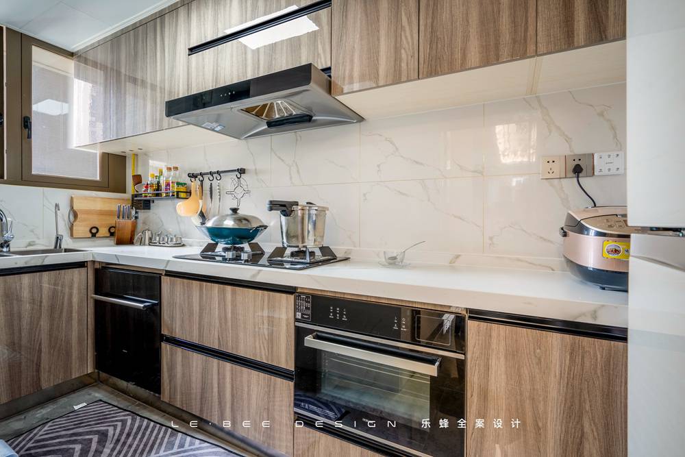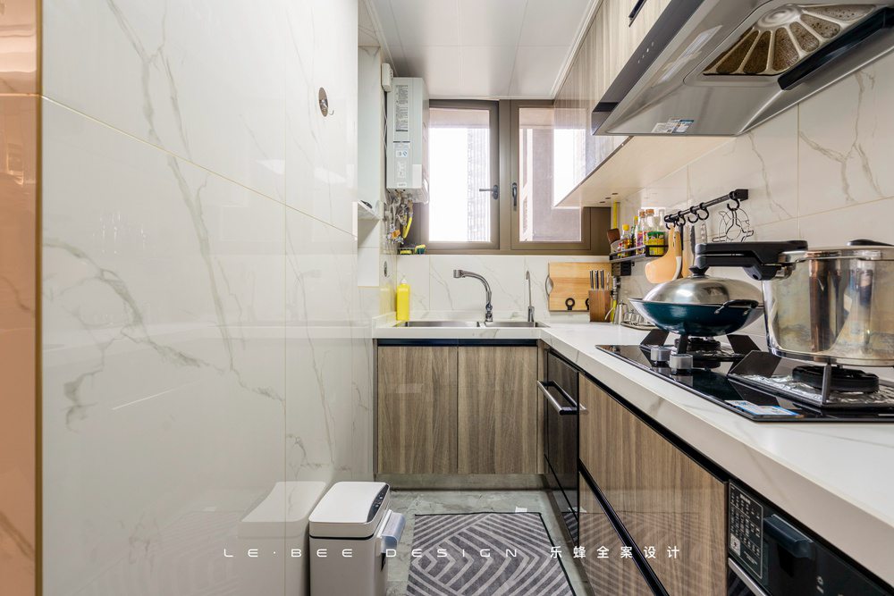 - 廚房實景圖 - 原木色家具總能給人清新淡雅的感覺,因此當原木色用在廚房上,實在是再完美不過了。干凈的質感線條設計,讓整體空間統一;操作臺面以石面為主,墻面大理石紋理感十足也方便清潔。