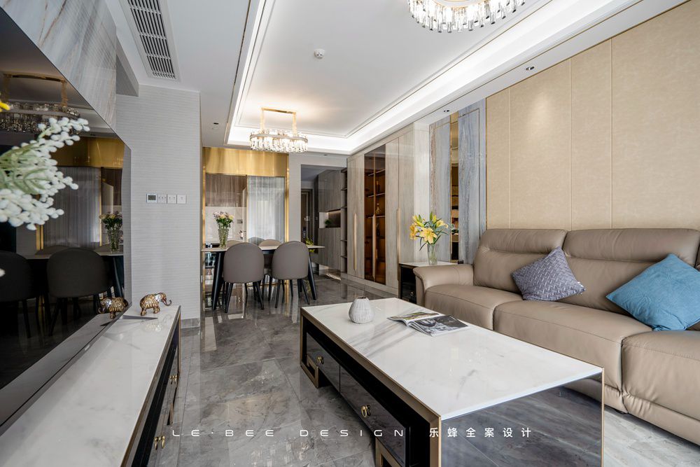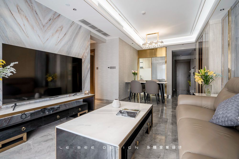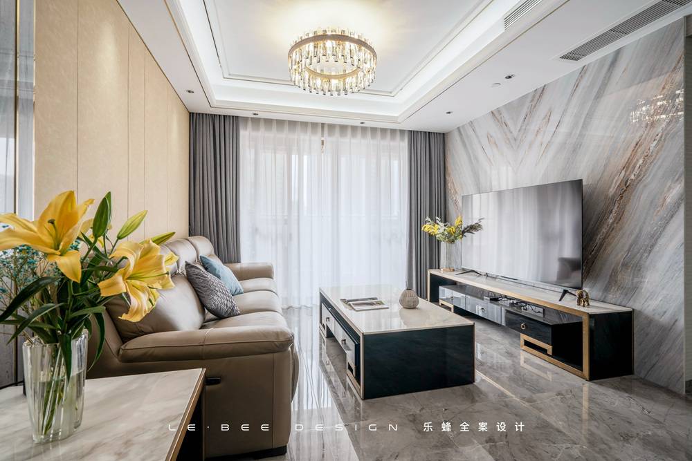 - 客廳以現代簡潔自然為主。電視背景墻采用是大理石材質,用比較特別的線條設計來展現港式的前衛時尚,大量的軟裝搭配,讓整個客廳不會顯得單調,凸顯質感。總體上給人一種自然簡潔、和諧寬敞的感覺。