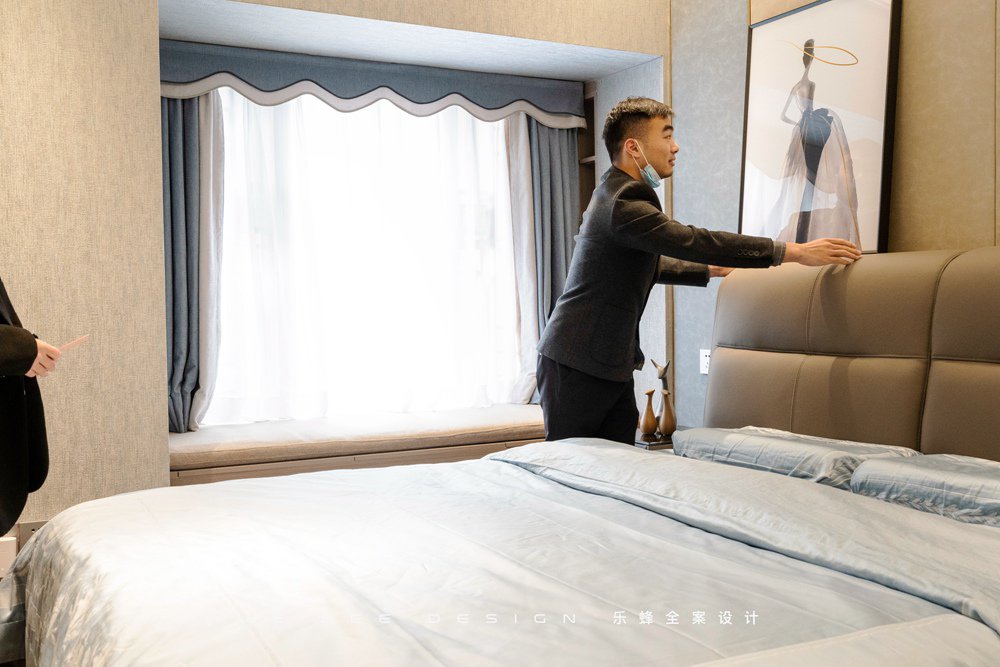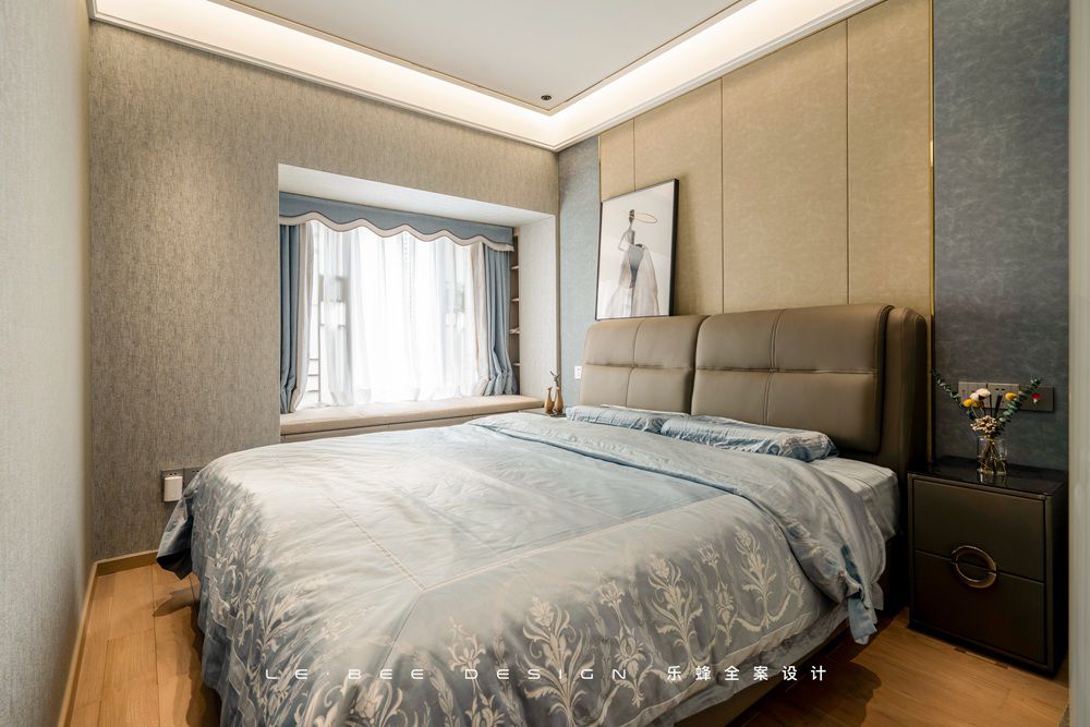 - 主臥實景圖 - 臥室在灰藍色的墻面基礎,掛上一幅北歐人物裝飾畫,布置淡藍色的真絲床鋪,簡潔素雅的床單布置,讓臥室充滿舒適輕松的氣息。