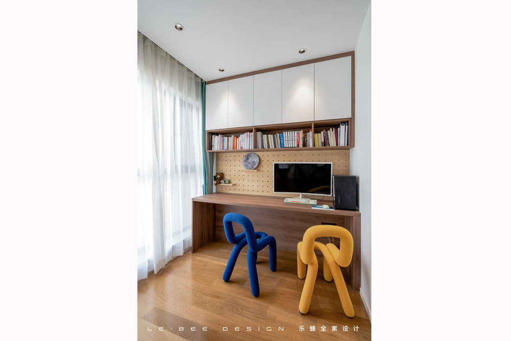 - 書房實景圖 - 書房區域落地窗整體較大的面積,給書房帶來了充分的采光,地面溫潤的木地板相比地磚能給人帶來更多的溫馨感。墻面根據收納的類型再設置洞洞板,根據收納的不同時期來調整洞洞板上收納的數量,同時也能作為裝飾增加房間的藝術感。