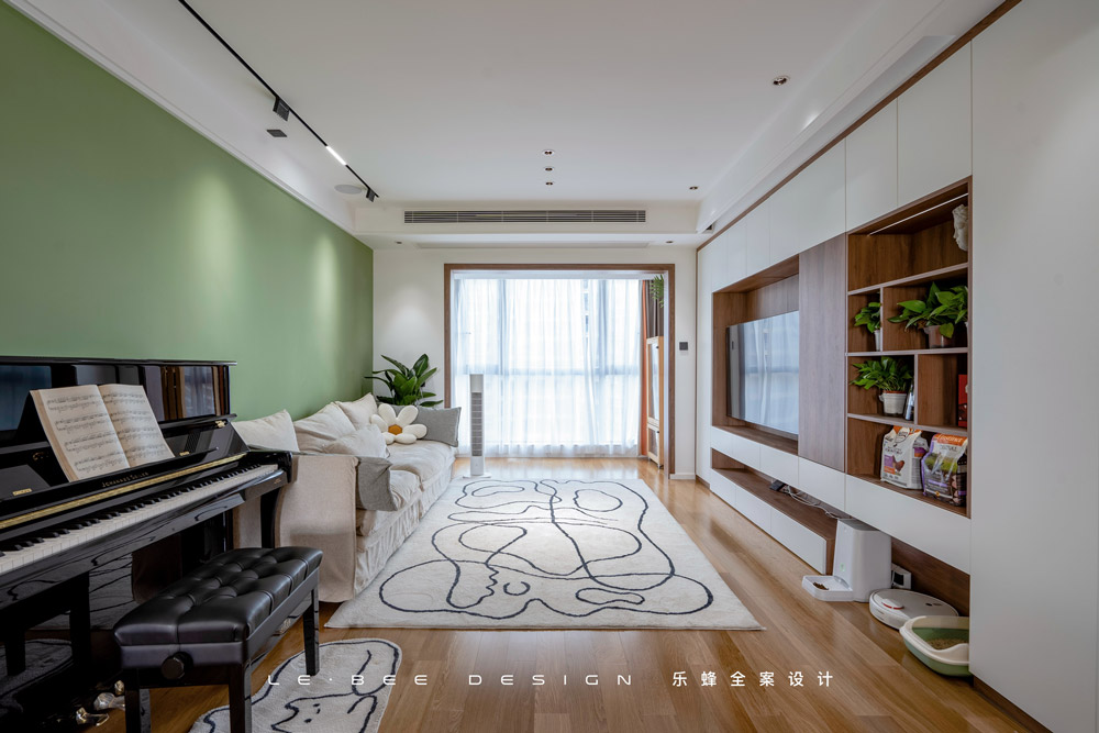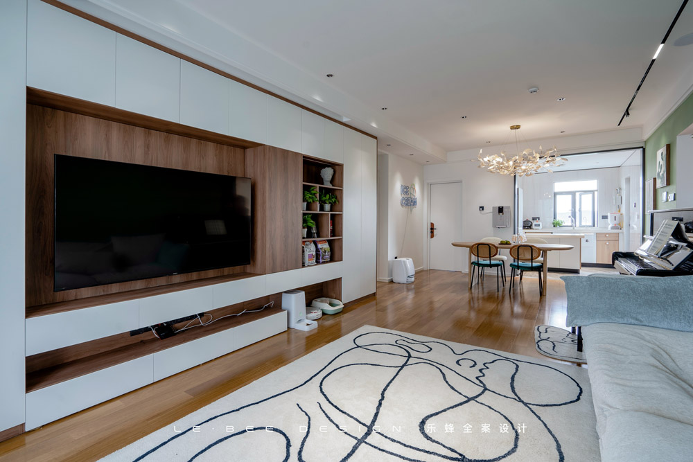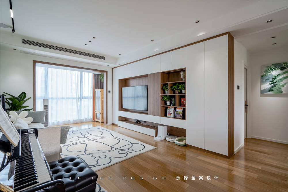 - 客廳電視柜在保持整體格調的同時又有不俗的收納空間,在底部設置貓砂盆和掃地機器人能夠很好的規整空間。