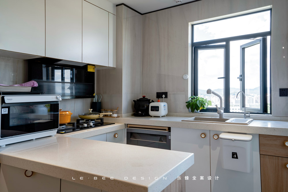 - 廚房實景圖 - 清新的整體氛圍也同樣延伸到了廚房, U型的櫥柜臺面在灶臺區和臺盆區中間做了高低分差,更加符合人體工程學;同樣吊柜也配合地柜帶來更多的儲物體驗。