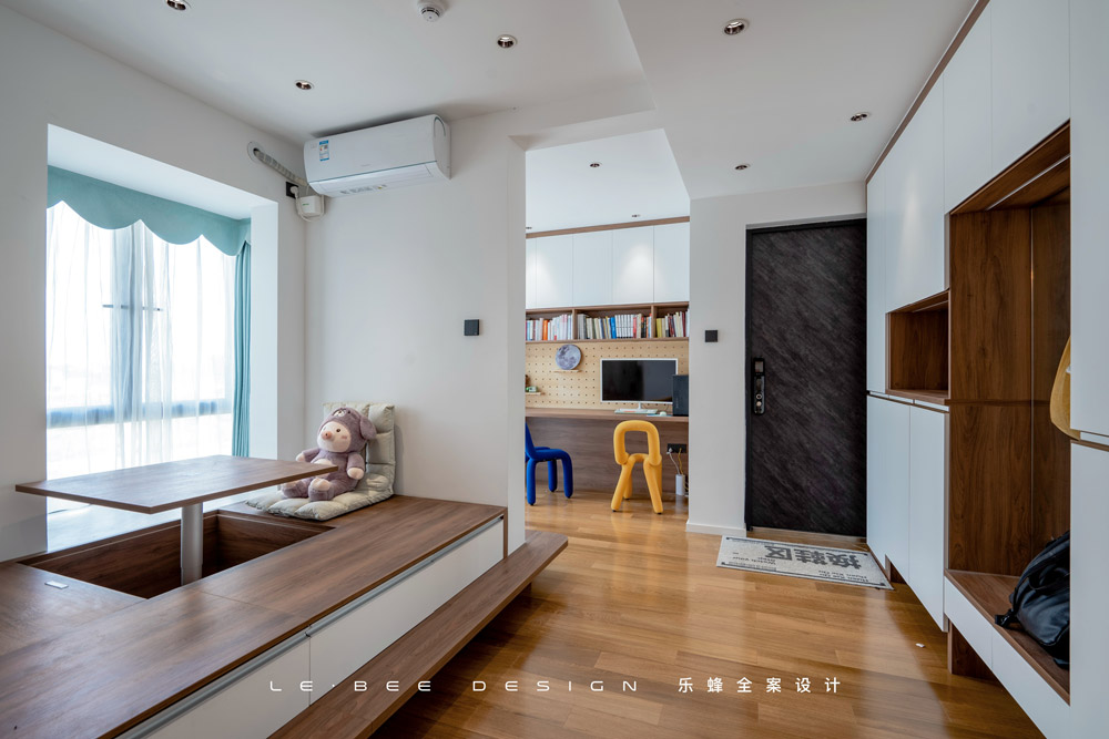 入戶的房間和陽臺墻體拆除,和整個玄關區域融為一體,做成書房+多功能房活動區域,整體入戶的格局被打開,視野感更加的好。