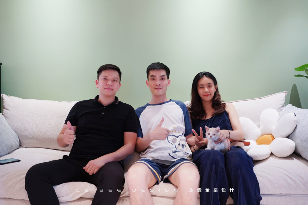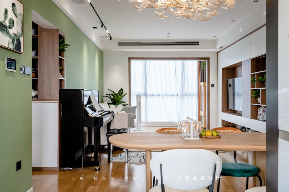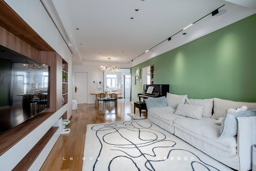 整體客餐廚一體的形式,讓空間顯得更加的開闊,沙發背景連通餐廳背景刷清新的綠色乳膠漆;看似簡單的吊頂除了暗藏筒燈和磁吸軌道燈之外,還加裝了暗藏式的投影和投影配合的全景音箱也相應的暗藏在吊頂里,整體視聽氛圍更加的好。