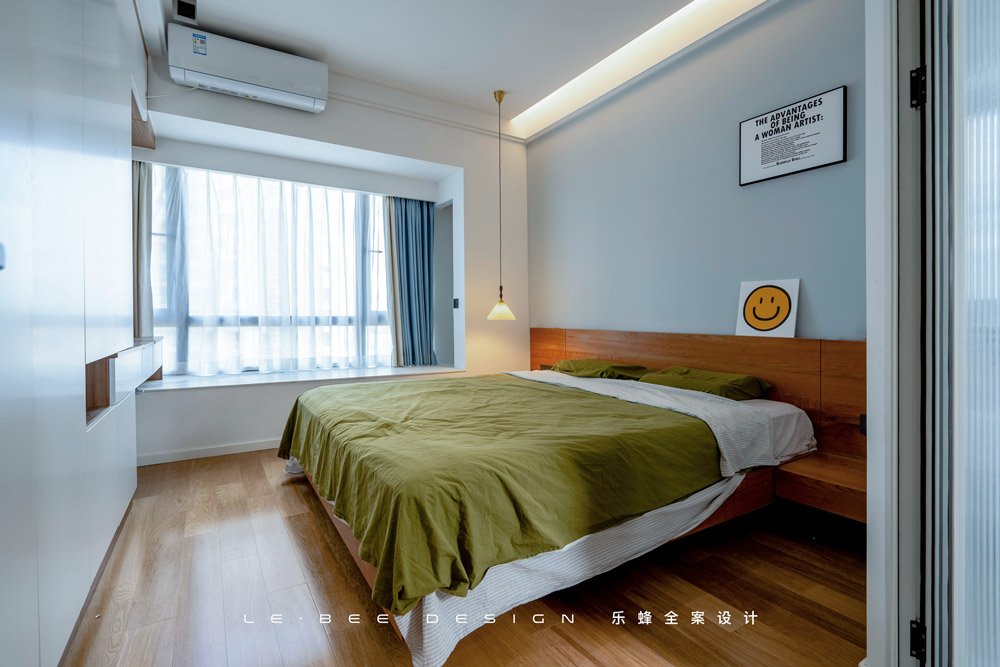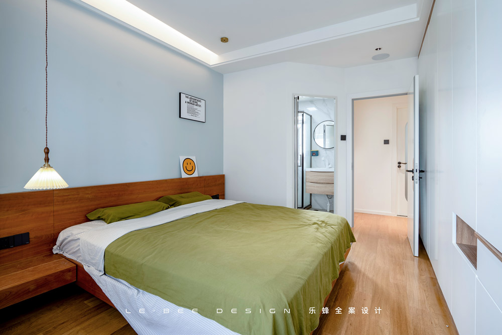 - 主臥實景圖 - 主臥同樣延續了小清新的格調,所有線條都干凈利落,床尾通過定制整面的衣柜來增加空間的收納,同時梳妝臺也和衣柜結合在一起,整體更加統一和諧。
