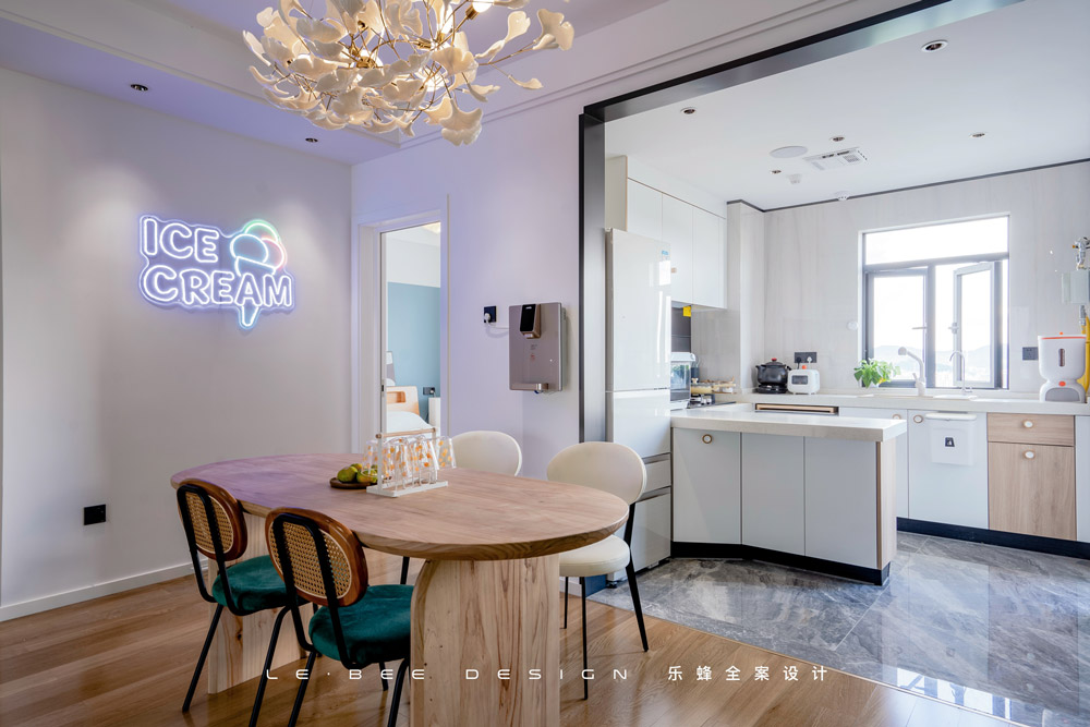- 餐廳實景圖 - 餐廳區域選擇原木色的一體式餐桌,加上設計感很強的餐椅,放置在餐廳中間四周形成回游動線;頂面白色的落葉吊燈更能體現整個空間的氛圍感。