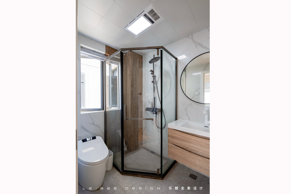 - 衛生間實景圖 - 主臥衛生間通過鉆石型的淋浴房做出干濕分離,也緊跟科技做了智能馬桶。包水管的地方另外鋪貼了木紋磚,給空間帶來更多藝術感和變化 。