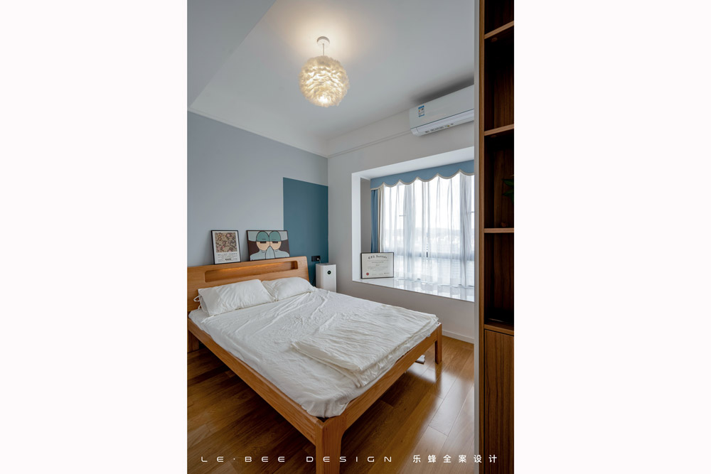 床頭背景涂上了整面的藍色乳膠漆,木質的床頭背景板和床頭柜還有床一起定制,加上笑臉和小掛畫的裝飾配一組復古的小吊燈,讓人身處其中心情不自覺就會變得很好。