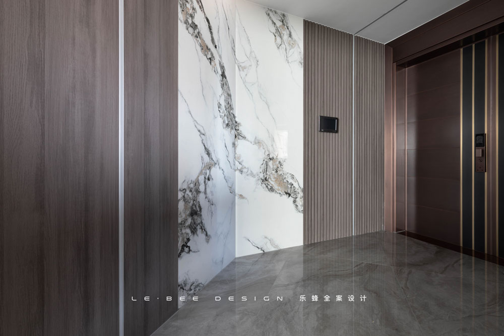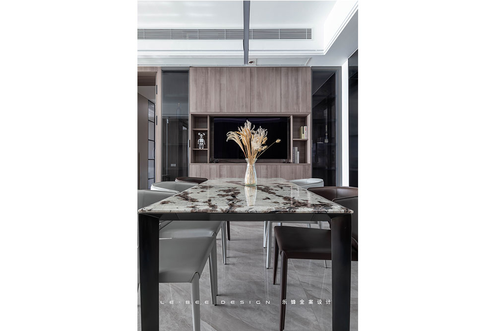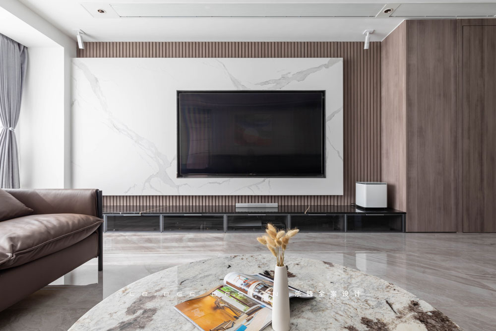 背景墻選用木格柵和大理石面板,精細計算的比例搭配,絕對舒適的視覺展現(xiàn)。
