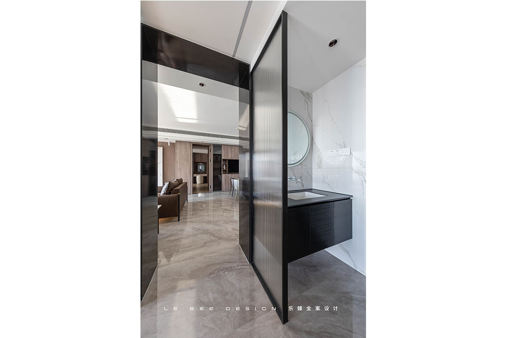 運用木格柵、大理石面板、木飾面板對墻面進行三分設(shè)計,奶白的大理石瓷磚和深褐的木質(zhì)面板,顏色和材質(zhì)的相互碰撞,空間的舒張、視覺的沖擊無限擴張。