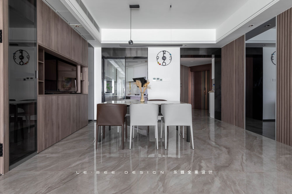 了半開放式和封閉式相結(jié)合的設(shè)計,暗色玻璃柜門和亮色木質(zhì)柜門相撞,相得益彰。