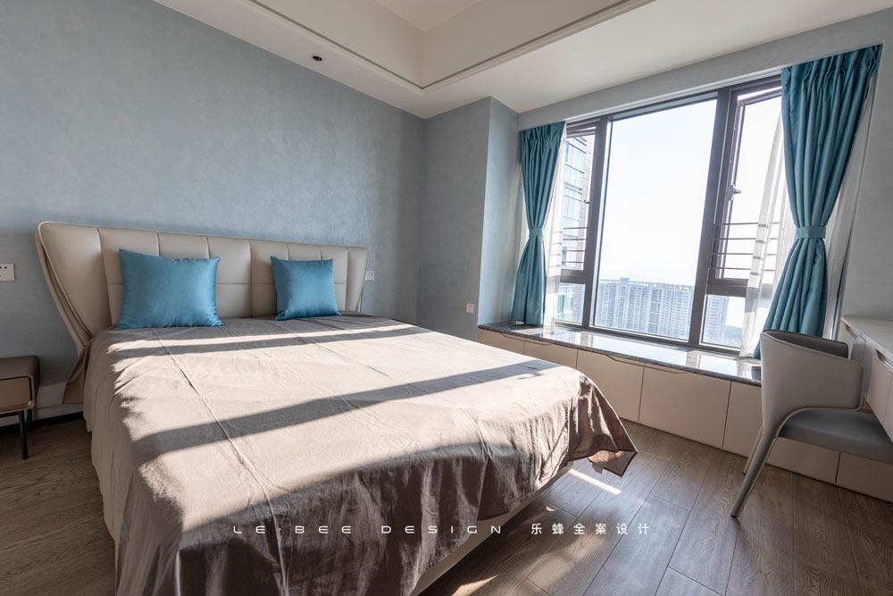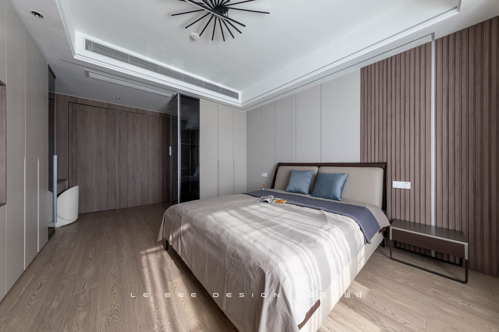 主臥給人的視覺感官倍感舒適,因為大面積的木質(zhì)墻面和木地板相連,視覺無過度,順滑無比。