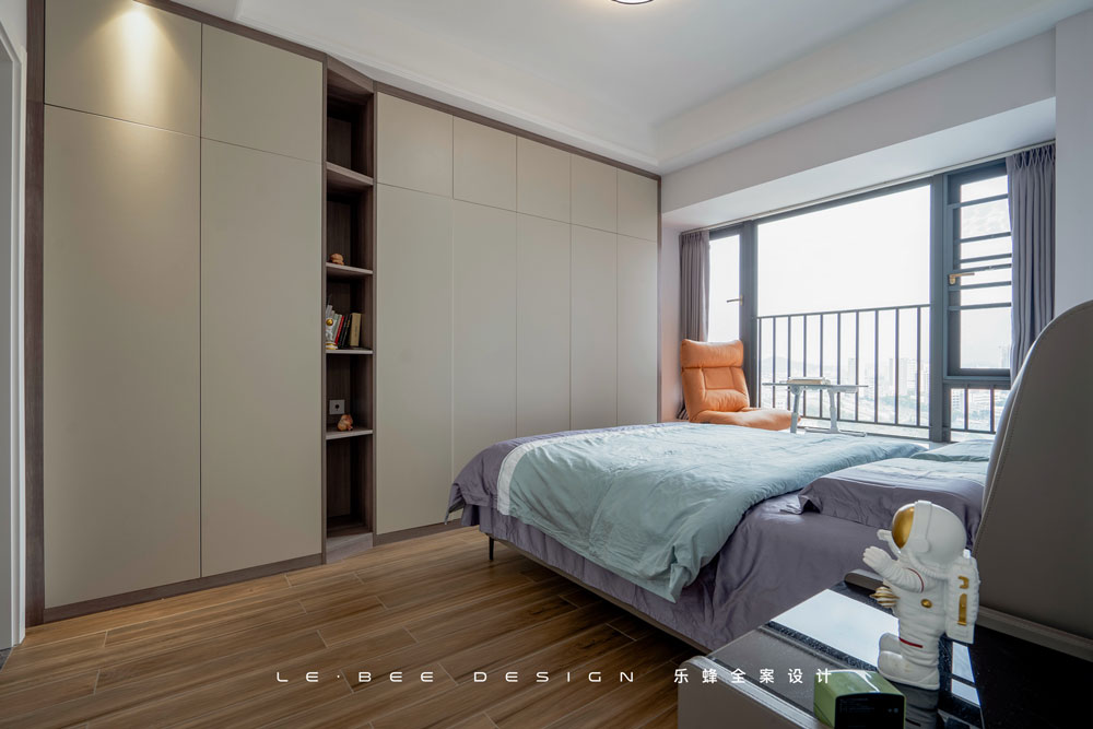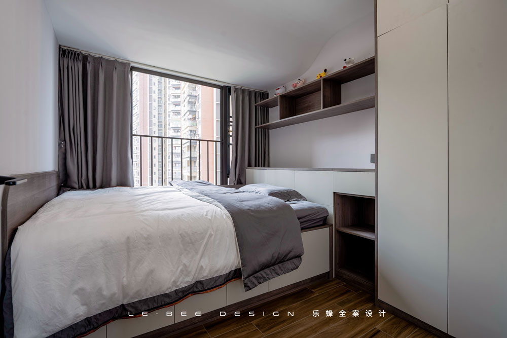 - 主臥實景圖 - 主臥在設(shè)計中更加強(qiáng)調(diào)儲物的充足和視覺空間的開闊,所以將床頭方向調(diào)轉(zhuǎn)到進(jìn)門一側(cè)。