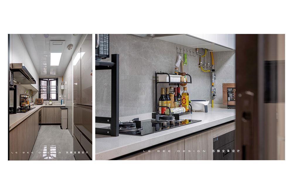 廚房在設(shè)計上完成了屋主想要在廚房里放冰箱的想法,我們在右側(cè)冰箱的位置做了墻體的折角,將冰箱嵌入進(jìn)去,同時也確保了空間的方正。