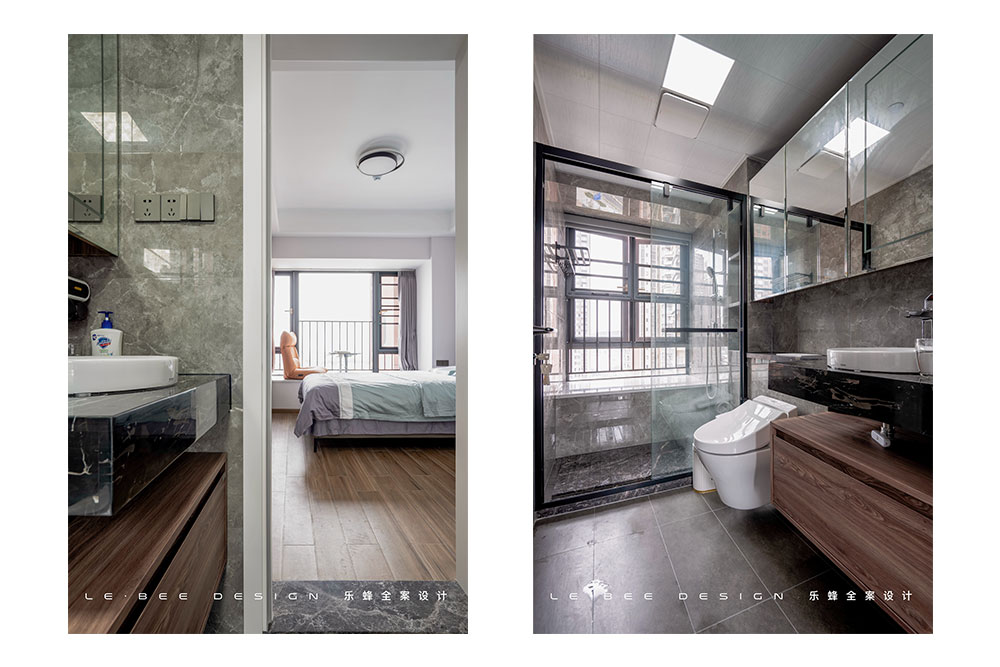 - 衛(wèi)生間實景圖 - 主臥配置的衛(wèi)生間采用了浴室柜和馬桶整體都抬高的設(shè)計,在日常打掃的時候不會有衛(wèi)生死角,同時淋浴區(qū)地面的大理石做了防滑的拉槽處理,更加安全。