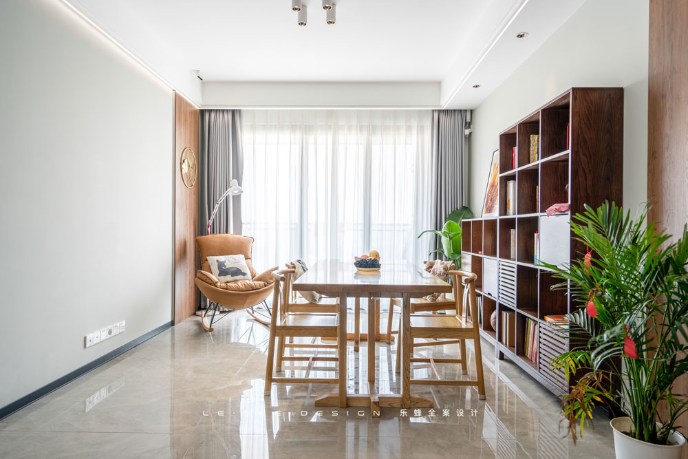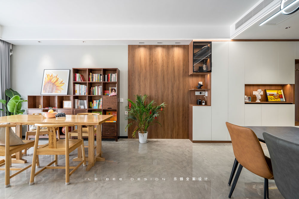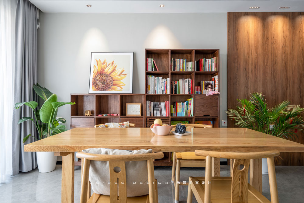 相比起傳統(tǒng)的休閑區(qū),這里更像是個(gè)讀書角。長桌椅取代了沙發(fā)茶幾,大書架取代了電視,不是傳統(tǒng)書香門第的嚴(yán)肅莊重,而是擁有更多自有的內(nèi)涵。
