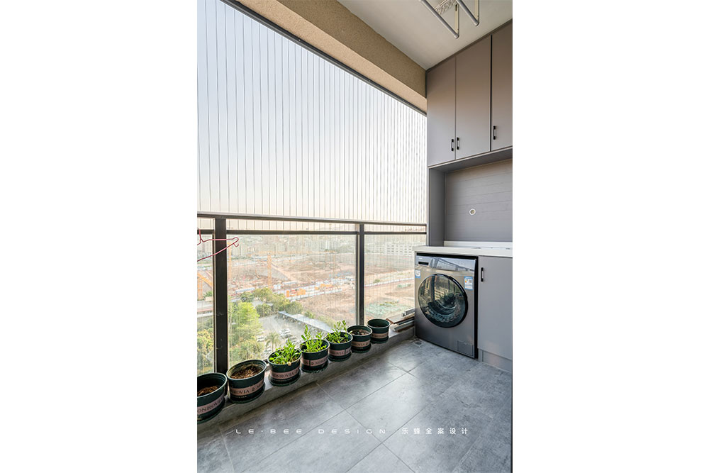 陽臺(tái)一側(cè)設(shè)計(jì)了一組陽臺(tái)柜,洗衣機(jī)內(nèi)嵌其中,儲(chǔ)物洗滌要求一應(yīng)俱全。