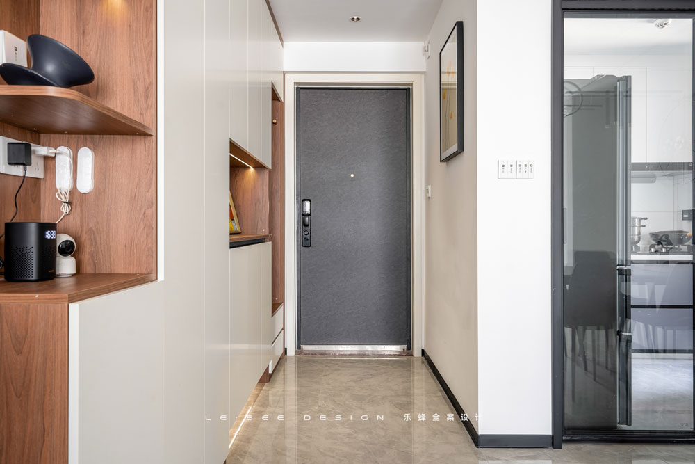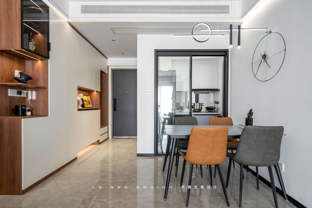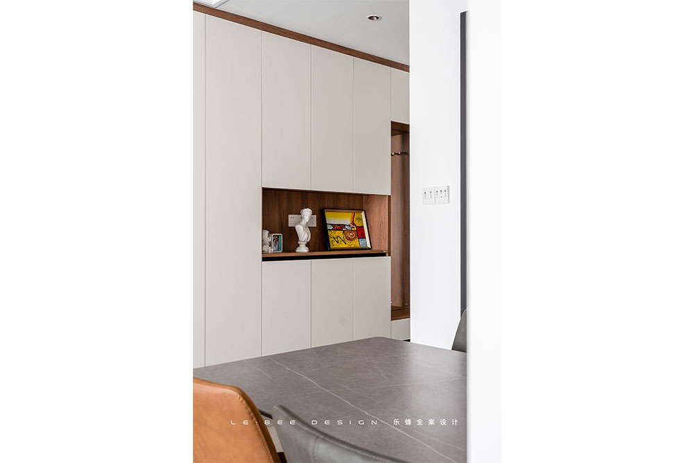 工整合理的格局使玄關(guān)的打造毫不費(fèi)力,連接餐邊柜的玄關(guān)柜其實(shí)沒有明顯的區(qū)分,然而在功能上,僅用凹凸的格局和造型就能囊括玄關(guān)所有的功能需求。