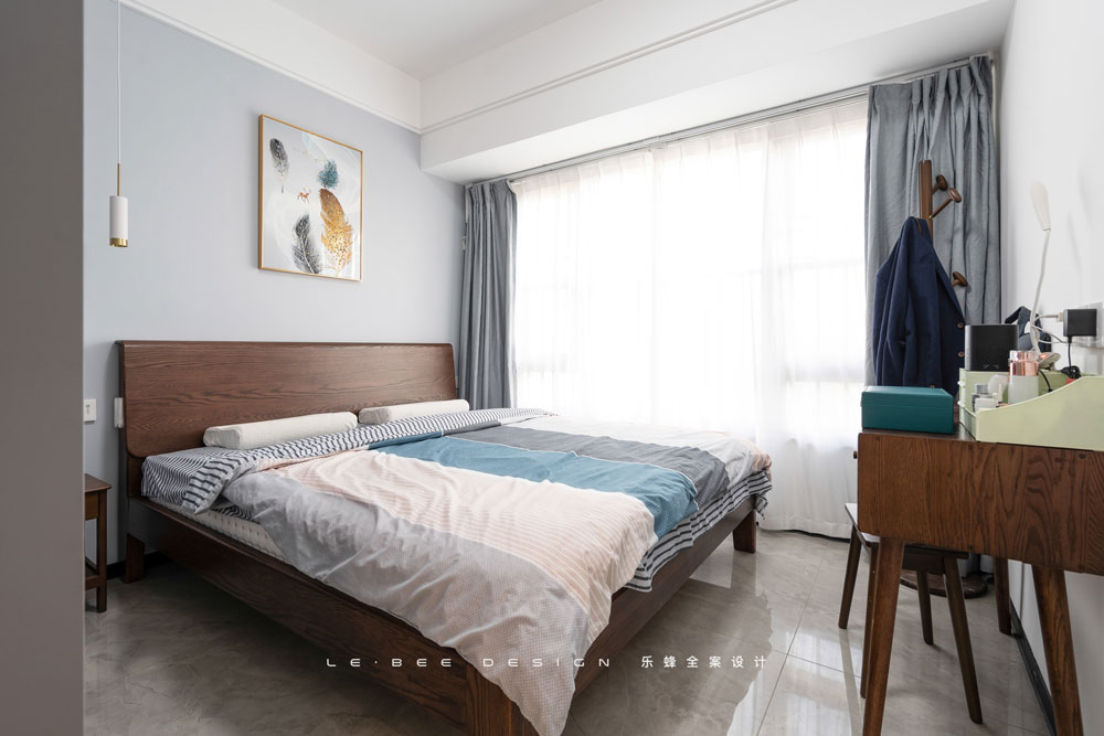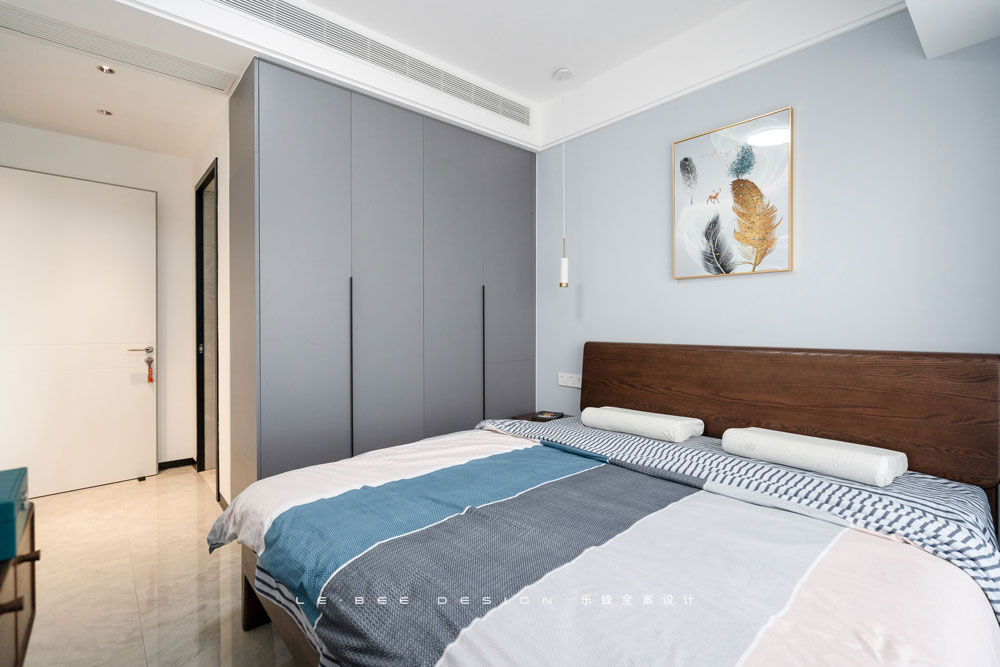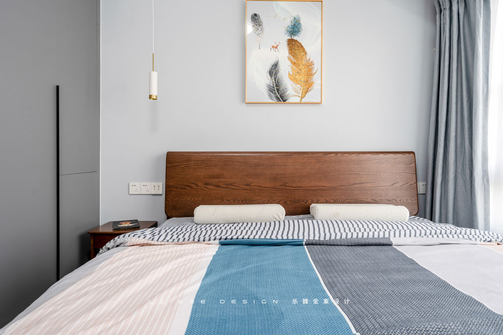 頗有北歐風(fēng)格的主臥并不會(huì)顯得突兀,清新自然質(zhì)感并沒有減少,因?yàn)檫\(yùn)用了莫蘭迪色系,灰的高級(jí)感使這個(gè)空間多了一絲北歐的冷調(diào)。