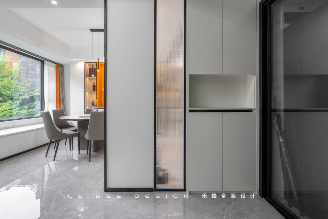 為了保證室內的隱私,入戶正對面設計了一組隔斷和柜體,隔斷沒有采取 實墻的方式,而是在墻體內部嵌入長虹玻璃,在美觀和透光度上更好。柜體作為玄關的收納,中部可做端景,集聚功能和觀賞性的玄關隔斷設計。