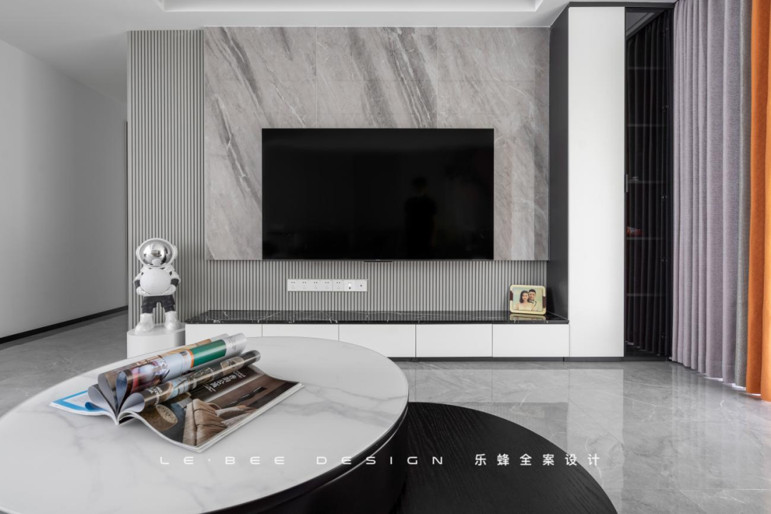 業主喜愛清冷的高級感,所以我們在整體風格的設計上采用了大部分冷色調,以灰、咖為主色大面積鋪貼,以黑、白為輔色進行細節的勾勒和點綴。在客廳的設計中,不同材質同一色系所體現的統一協調之感被發揮得淋漓盡致。