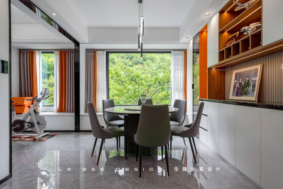 優越的觀景視野和采光,餐廳哪怕是精簡布置也賞心悅目。一面餐邊柜承載餐廳收納功能,另一面與玄關相通,增強了空間之間的連通和通透感,原本隔斷拆除后,窗外的山景一覽無余,山景氛圍餐廳應運而生。