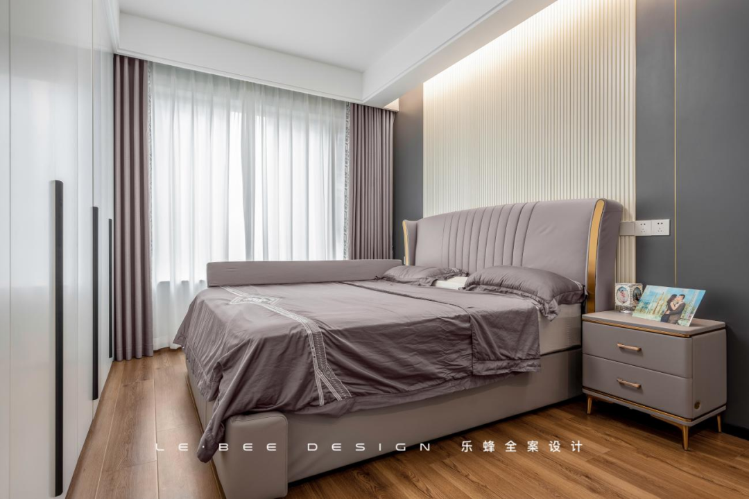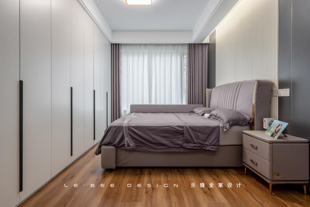 莫蘭迪紫色高貴沉穩,在白灰和原木風的硬裝基礎上,選擇莫蘭迪紫色軟裝,無差異感融合。主臥吊頂選擇雙眼皮吊頂,在常規的設計中加入了內嵌燈帶,室內燈光分布更加柔和有層次,燈帶代替壁燈,睡前用作局部照明,氛圍感滿滿。