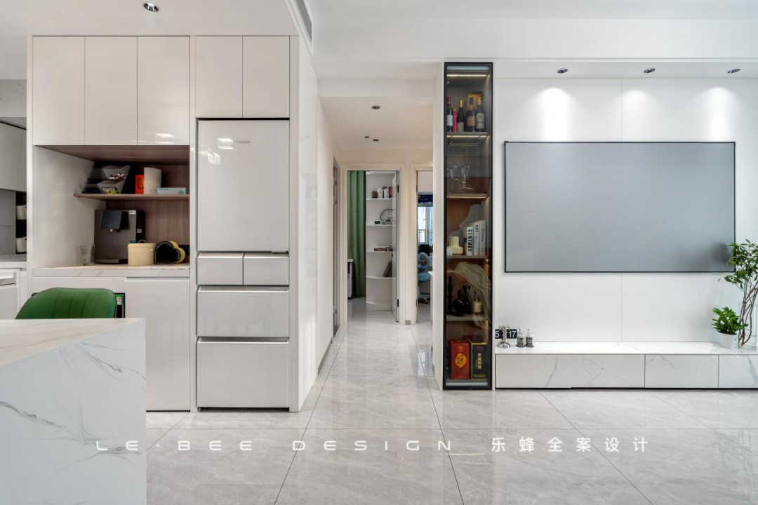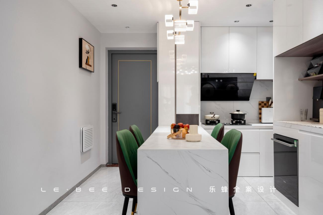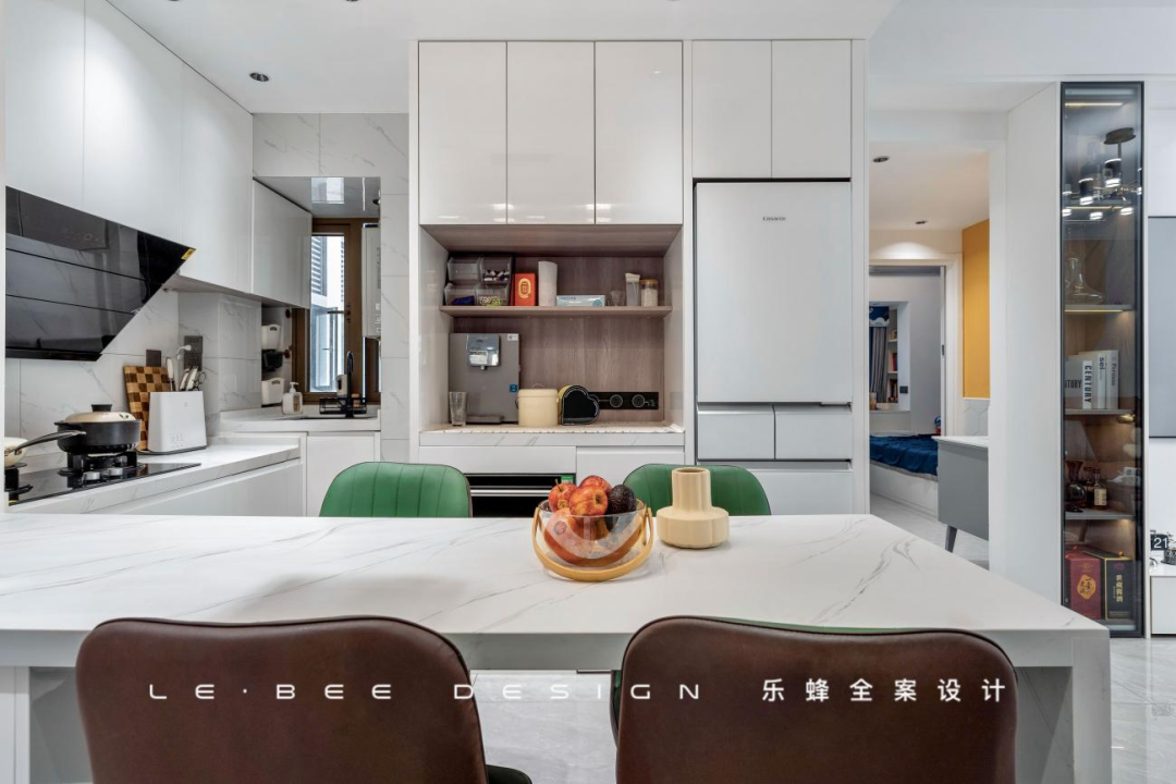 餐廳和廚房一體白色系,潔凈典雅,餐桌以吧臺的方式取代,多了更多休閑色彩。