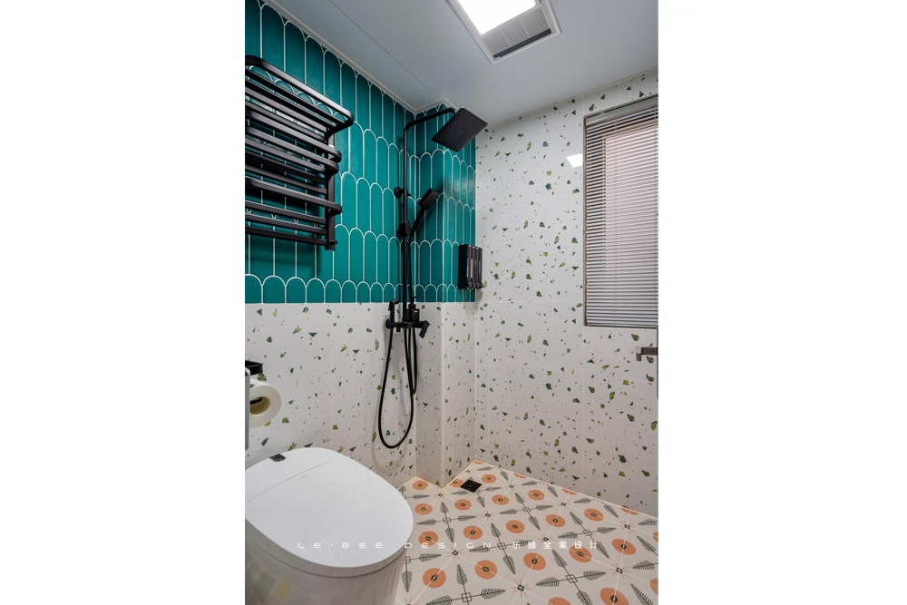 洗手盆外移至過道處,墻面運用六角磚和防水涂料,蛋黃色和莫蘭迪藍結合,打造既復古又小清新的一角,日常的洗漱也變得有趣起來。