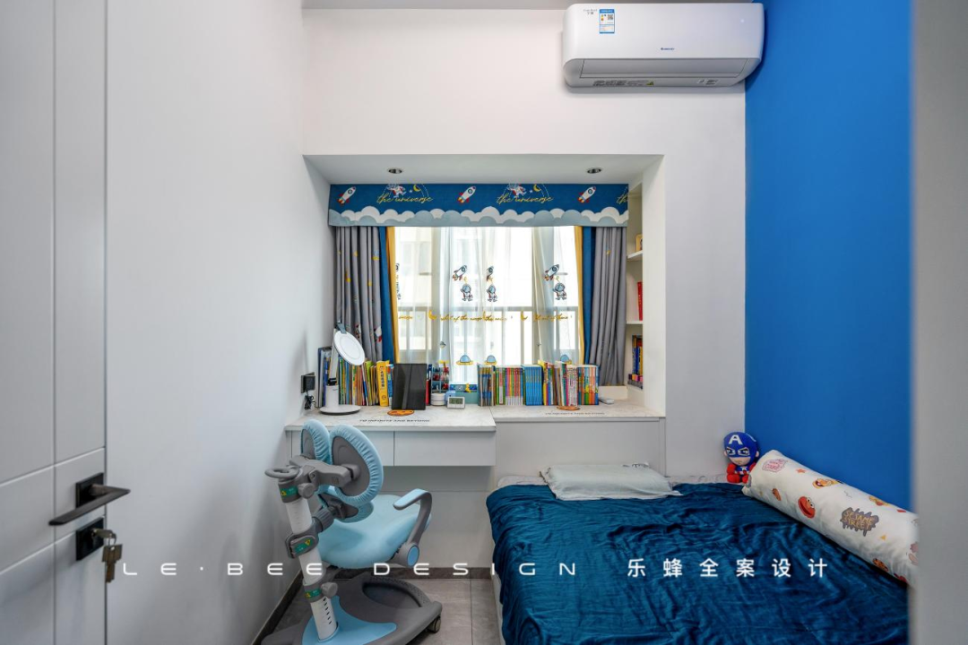 兒童房為小男孩居住的房間,男孩酷愛藍色,所以在兒童房中采取了大量的藍色。床邊背景選擇克萊因藍,亮眼之余還頗具時尚感。