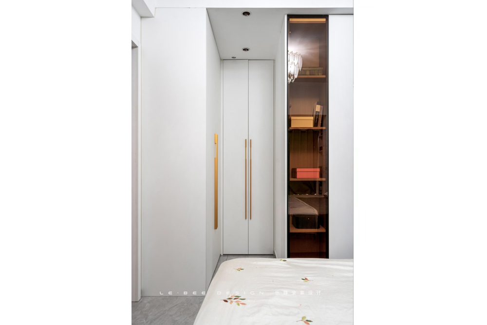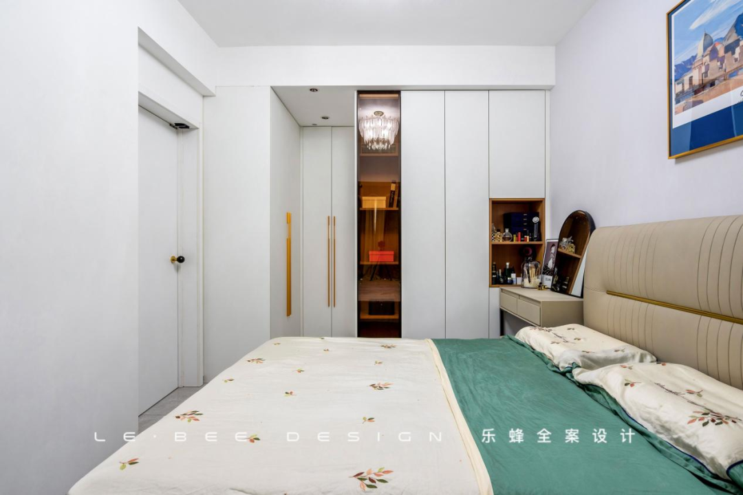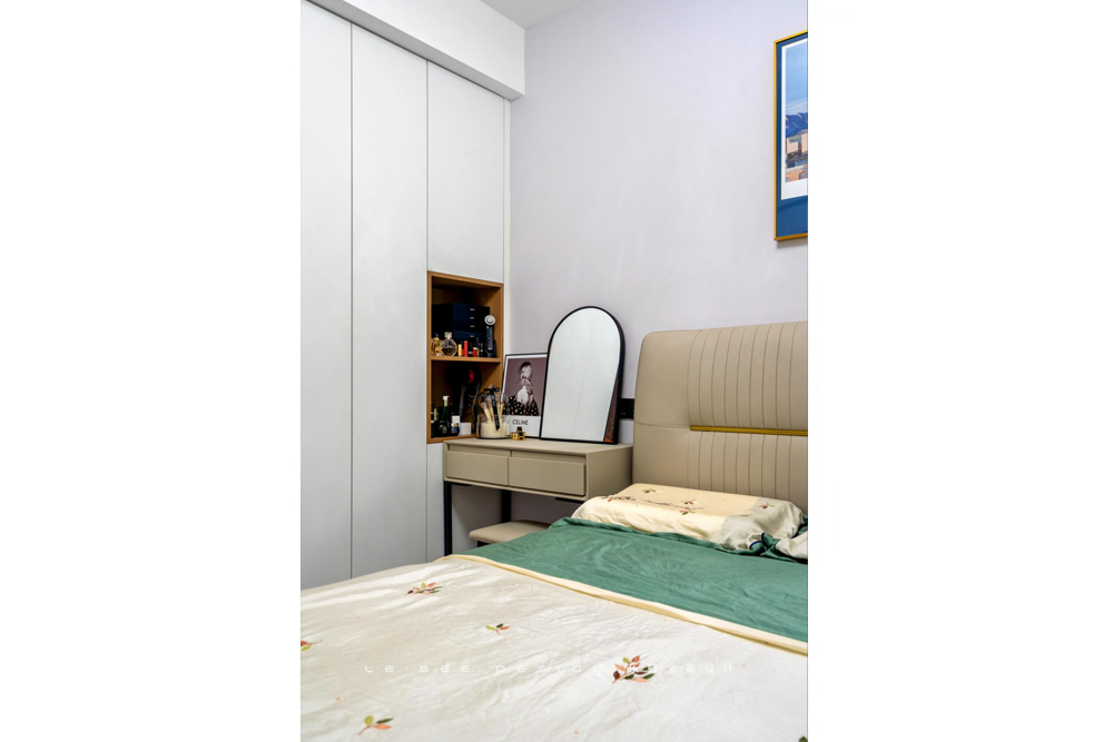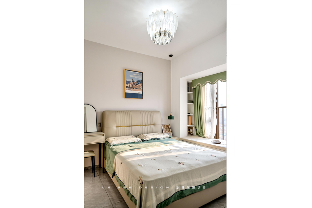主臥風格更加清新田園,同樣沒有采取深色作為背景,在軟裝上也采取了溫柔的米色系和綠色系,在這個空間中永遠都能擁抱春天。