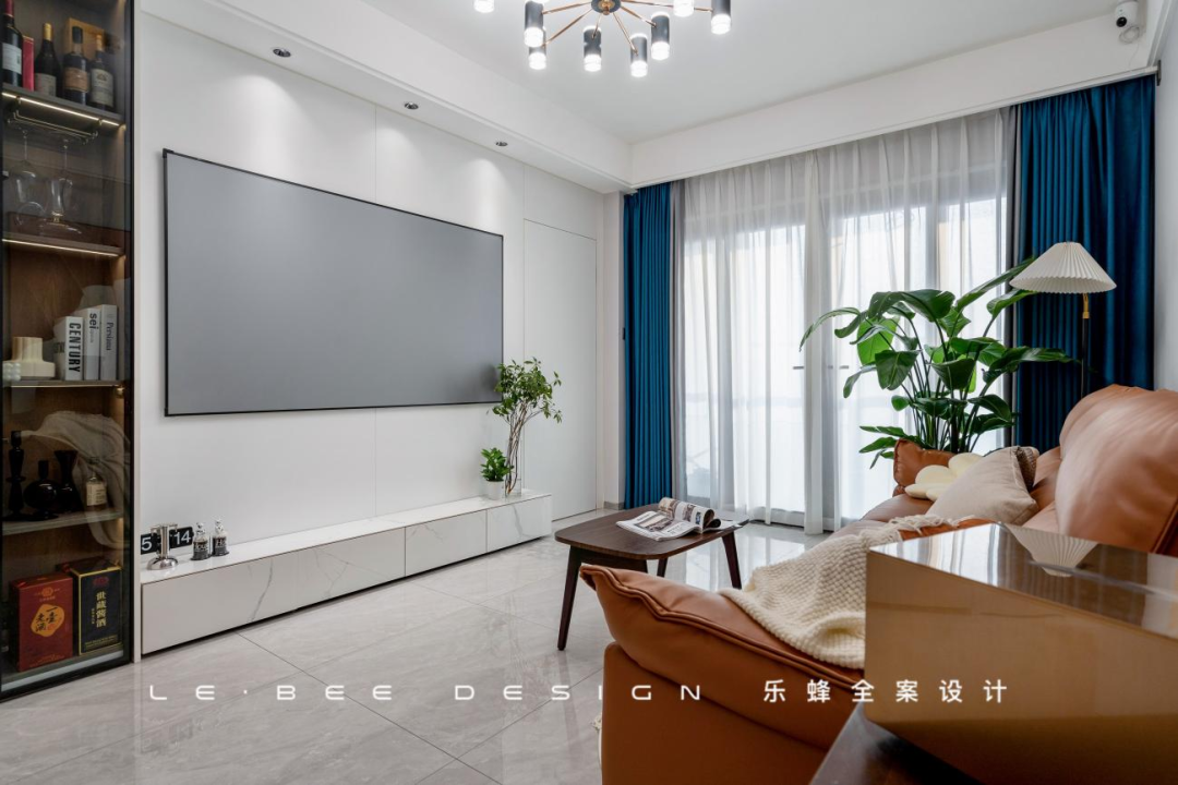 為了不拉低層高,減少空間的壓抑感,客廳選擇了主燈形式,四周設計雙眼皮吊頂和墻面銜接,頂面和墻面過渡自然。