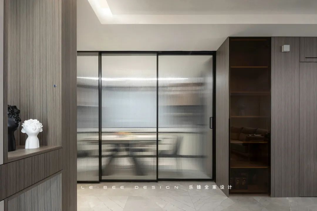 餐廳和廚房做了一個西廚的設計,納為了一體,用長虹玻璃推拉門作為隔斷進行空間分割。餐廳一側做了一組展示柜,方便酒水的存放。