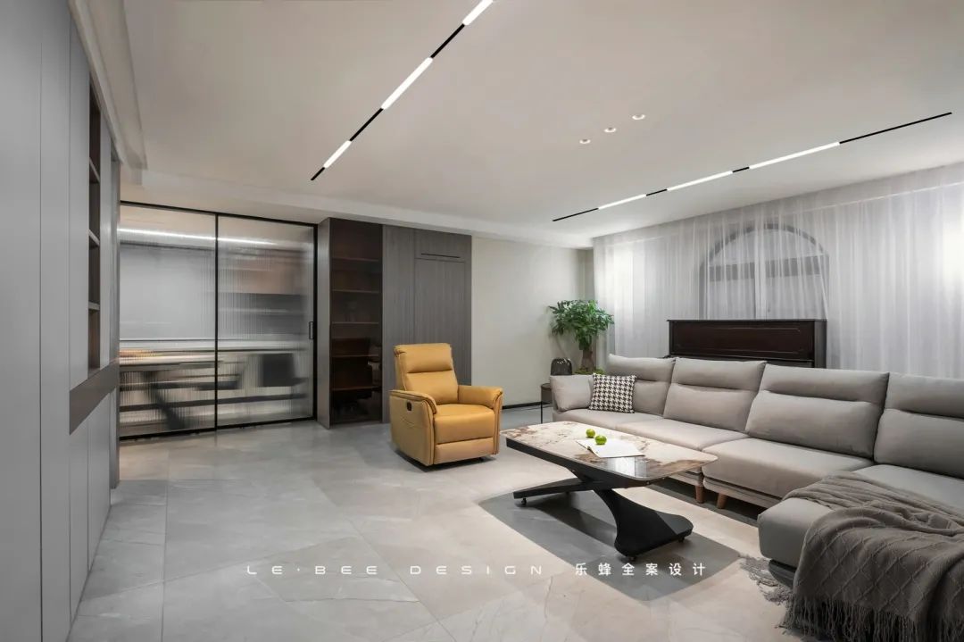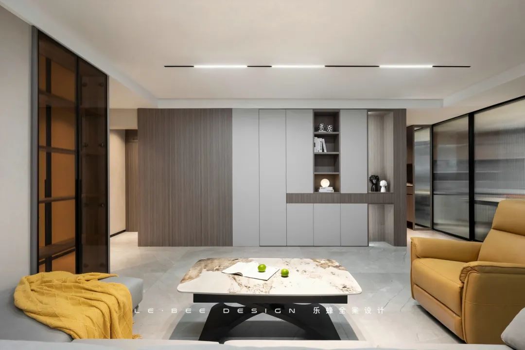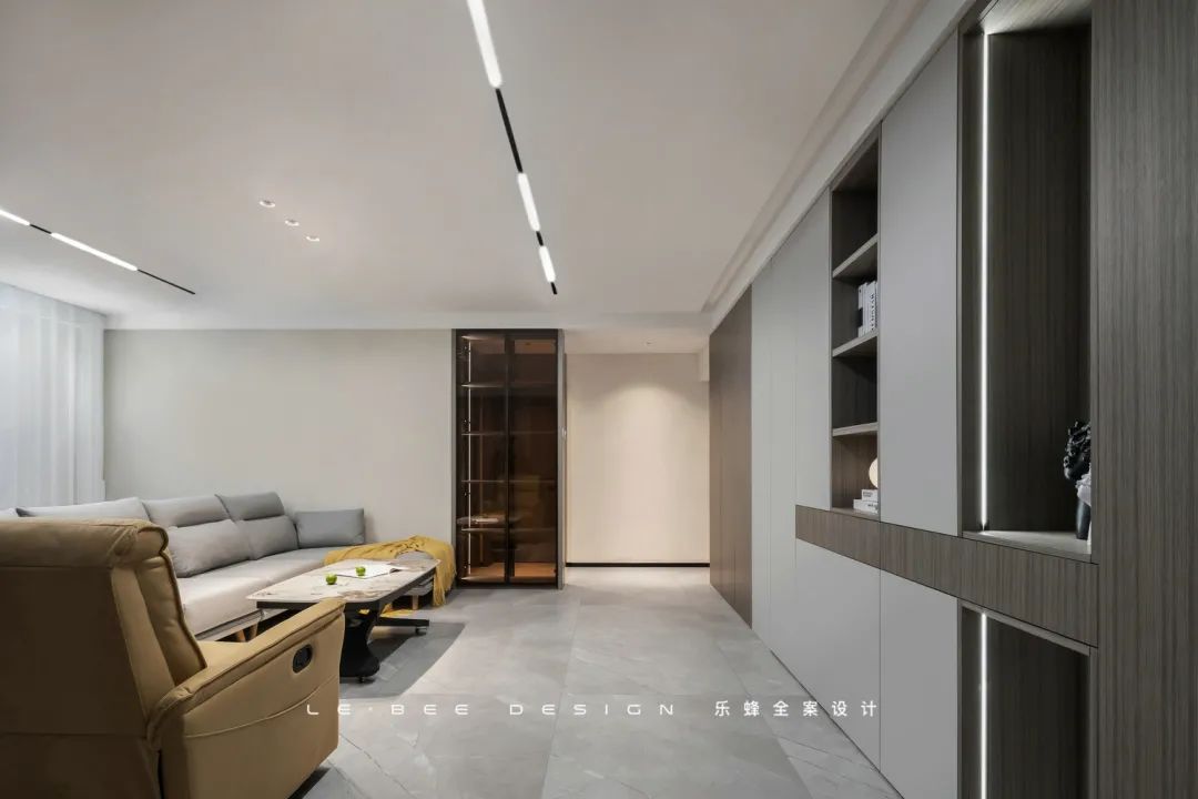 客廳取消了電視,因為業主日常生活中沒有看電視的需求,更珍惜家人在一起陪伴和玩樂的時光。取而代之的是一整面的柜體設計,材料選用兩種不同材質,于屋內的色調相互呼應。柜體做了一部分的開放設計和端景設計,虛實結合,同時也增加了屋內的收納容量。