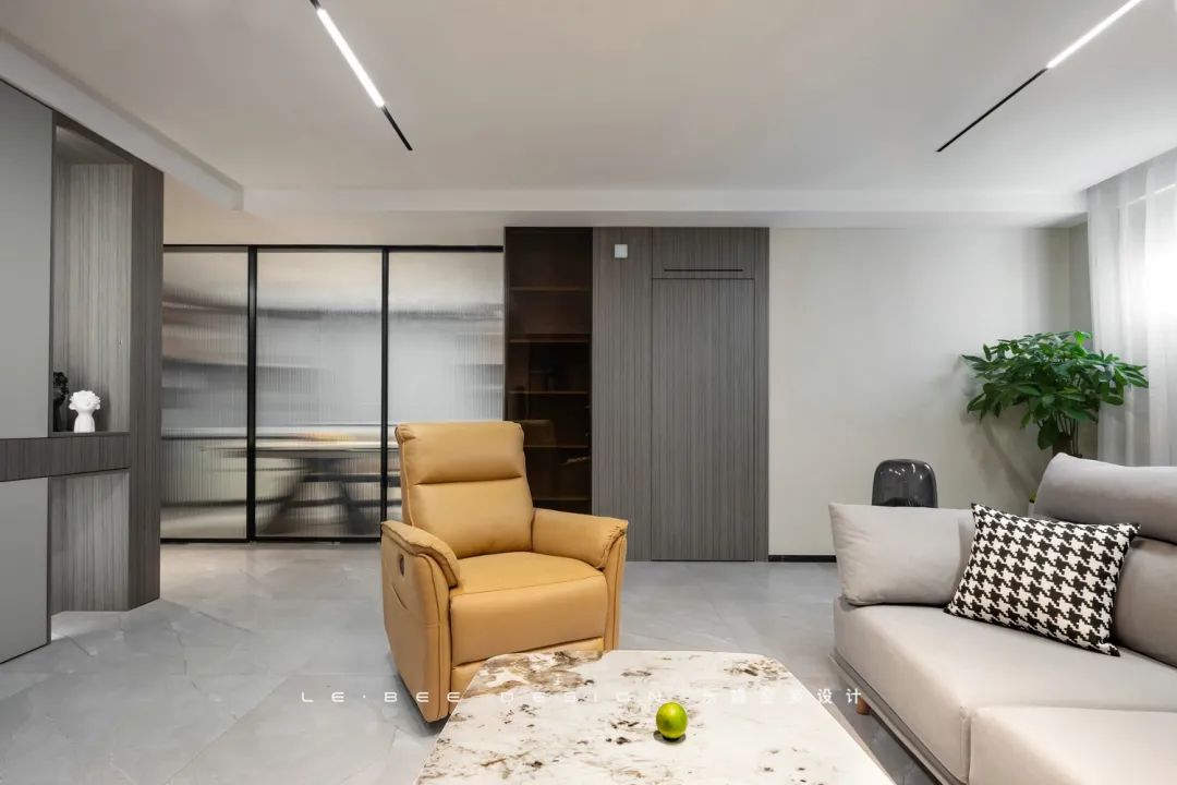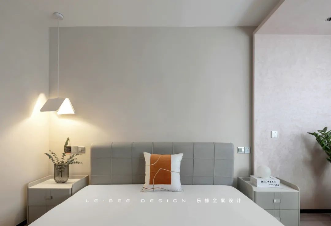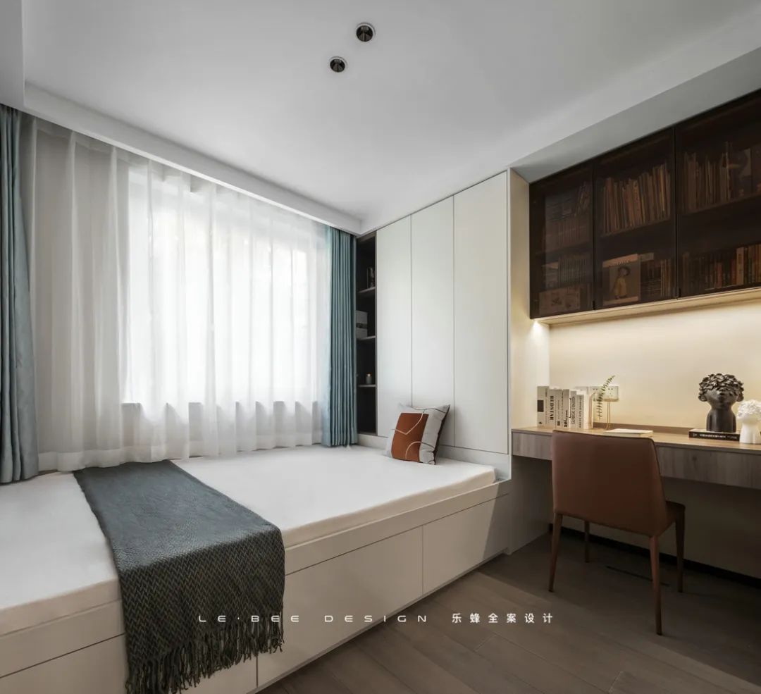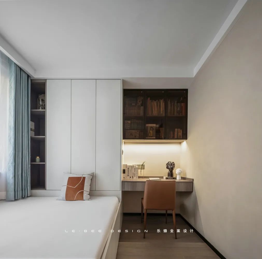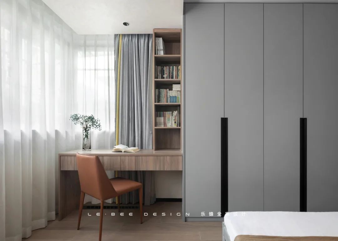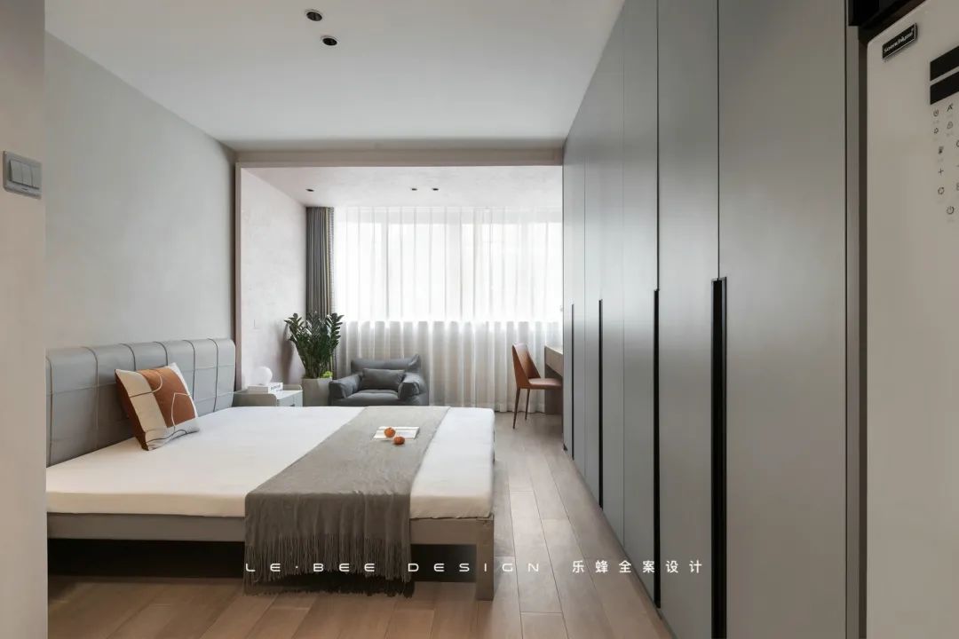 主臥空間布局舒適,工作和休閑放松都不顯局促。最亮眼的是整面墻的衣柜設計,儲物空間拉滿,內扣把手含蓄內斂不占空間。
