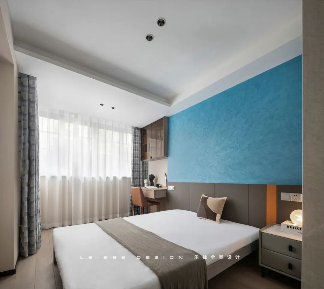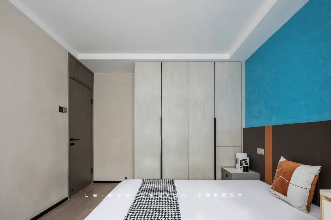 兒童房整體風格和主臥形成統一,背景墻加入了明亮的藍色,更加活潑跳躍。窗簾選用格子印花,增加室內元素。同樣也是做了到頂的衣柜,收納變得輕松簡單。