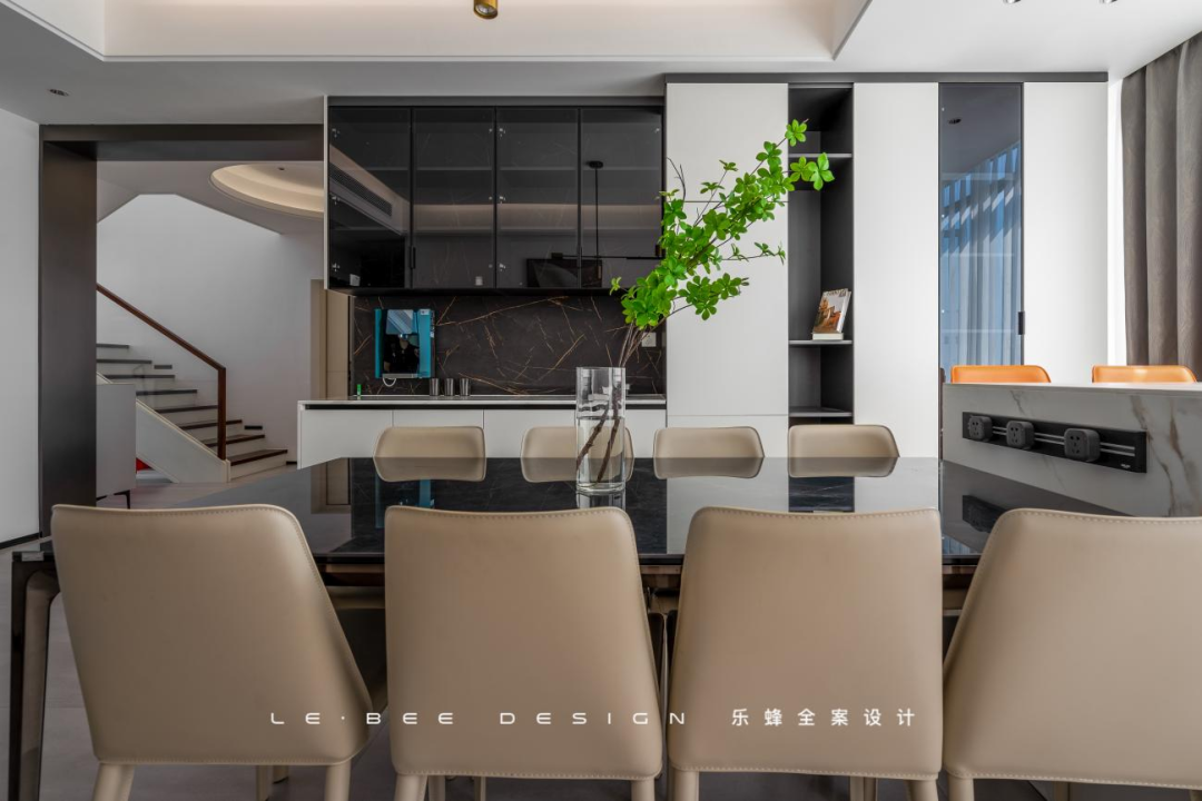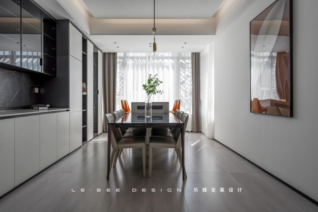 將陽臺空間納入餐廳后,餐廳的采光更加明亮優越。獨立的餐廳空間注重功能的極致發揮,在用餐的舒適度和餐廳的收納功能上,我們都做了最極致的設計。