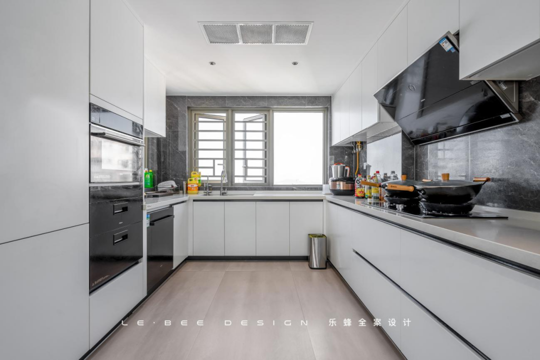 對于下廚愛好者來說,能擁有一個大廚房簡直就是畢生夢想。廚房的面積尤為可觀,U字型操作布局,將廚房的每個角落都利用上。櫥柜設計了吊柜、矮柜和高貴的形式,滿足廚房不同類型的收納需要。